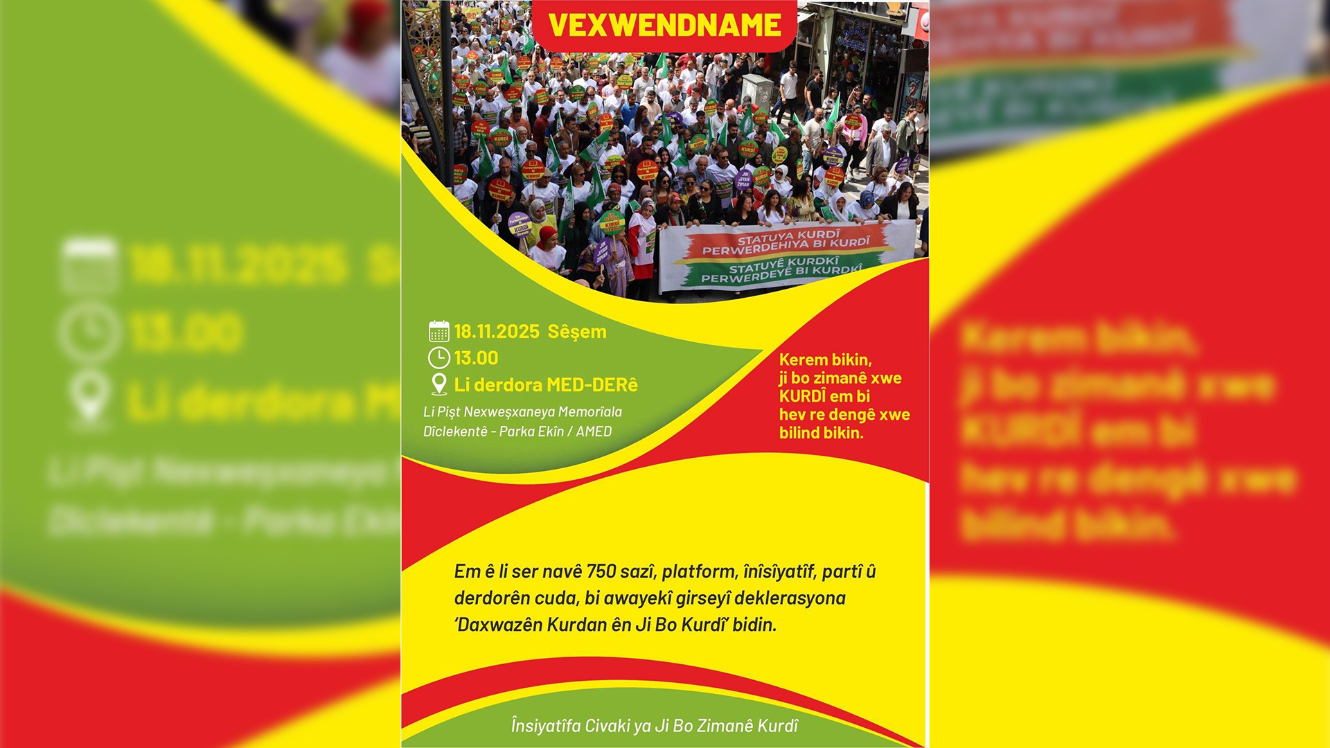 Înîsiyatîfa Civakî ya Ji Bo Zimanê Kurdî dê ji bo daxwazên gelê Kurd ên derbarê zimanê Kurdî de bi îmze û beşdarbûna zêdetirî 750 sazî, dezgeh, platform, partî û derdorên Kurd û demokratîk ên civakî yên li bakurê Kurdistan û Tirkiyeyê di 18ê Mijdarê saet 13.00an de li Parka Ekîn Cerenê ya li navçeya Peyasa Amedê bi awayekî girseyî deklarasyoneke hevpar bi raya giştî re parve bikin.