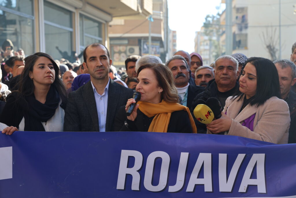 Ewilî Hevseroka DEM Partiyê ya Rihayê Ayşe Surucu axivî. Ayşe Surucu diyar êrişên li ser Kurdan tên meşandin pêk tê şermezar kir û wiha got: “Em li Pirsûsê berxwedana gelê Kurd ya ku ji bo azadiyê silav dikin. Dilê me li cem gelê me ye.”