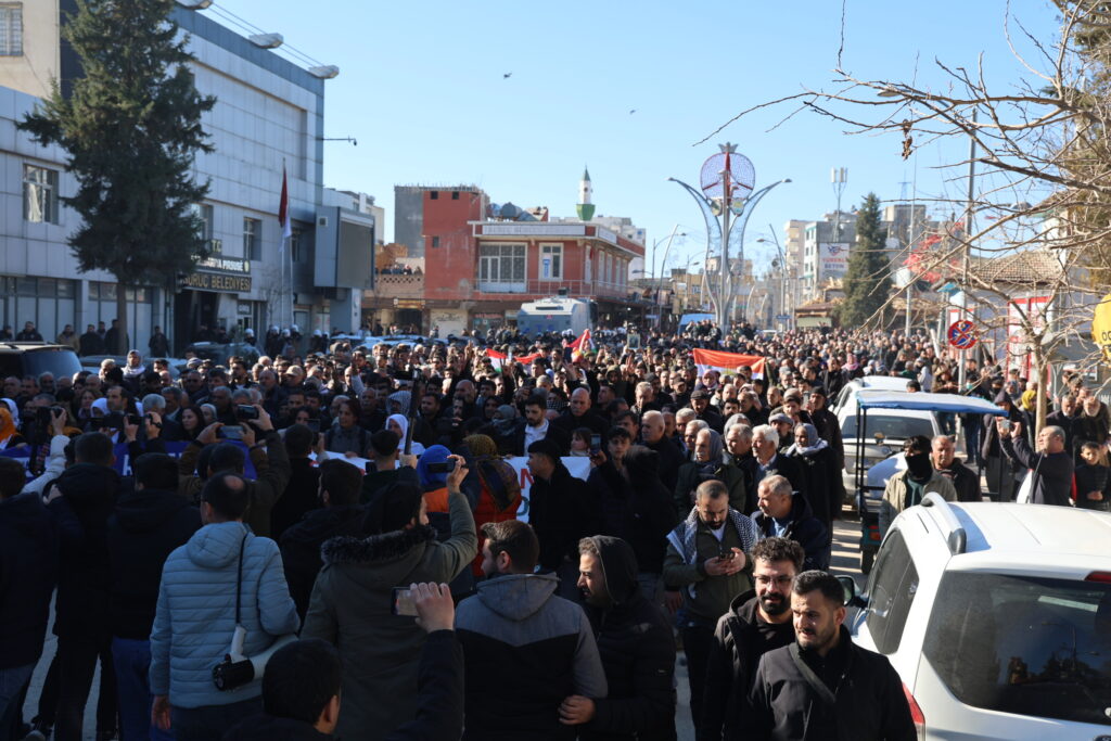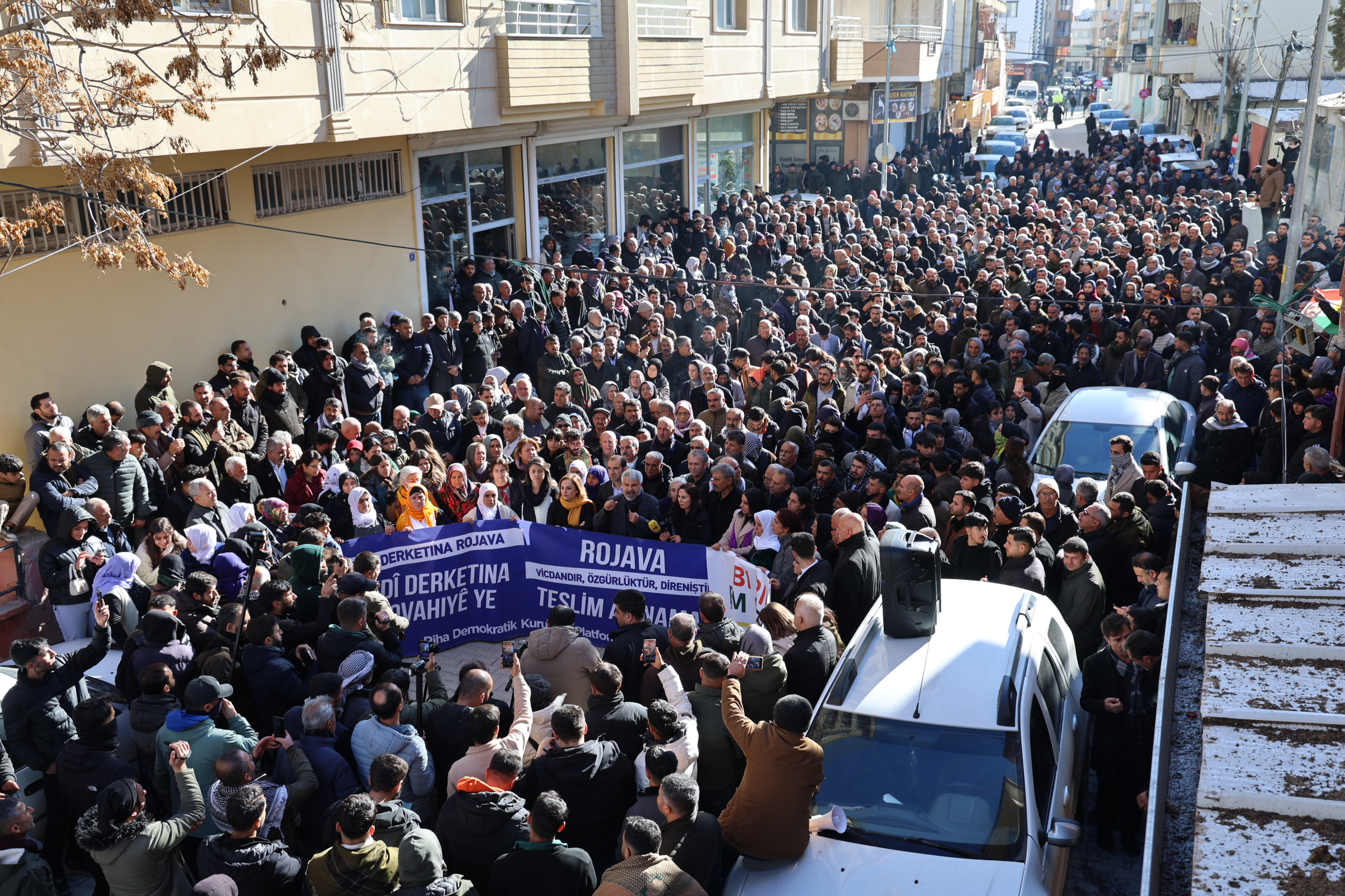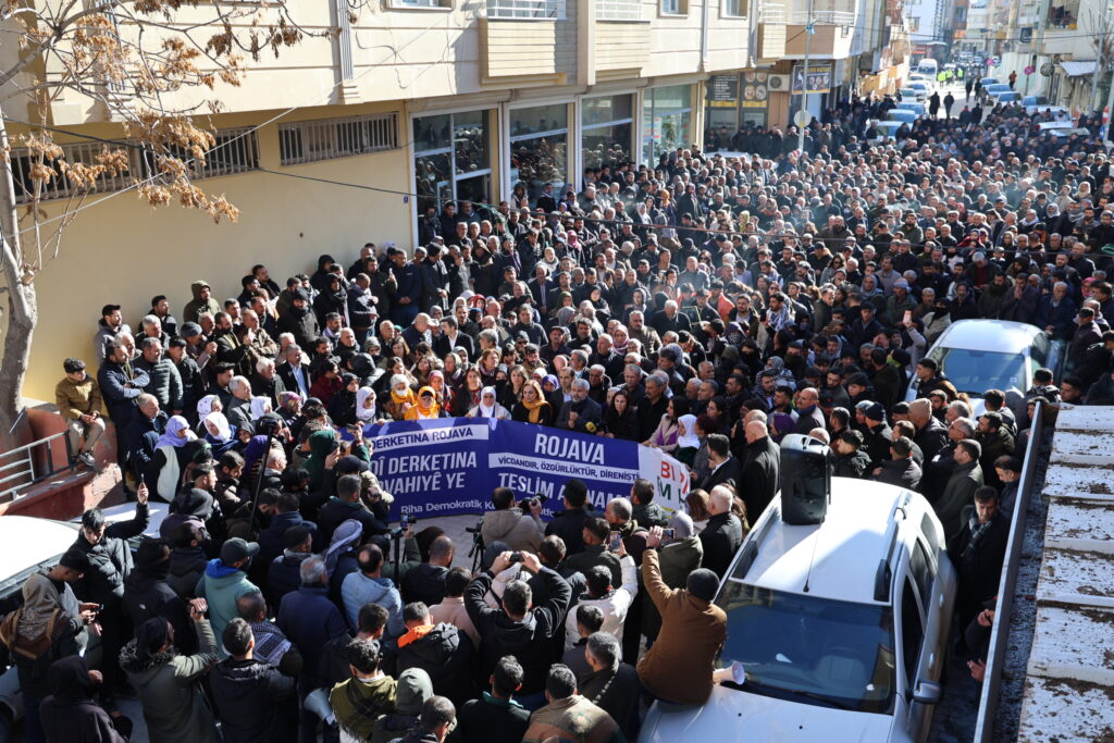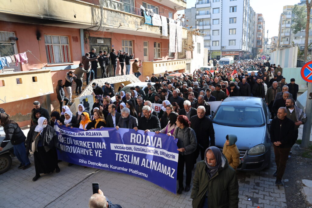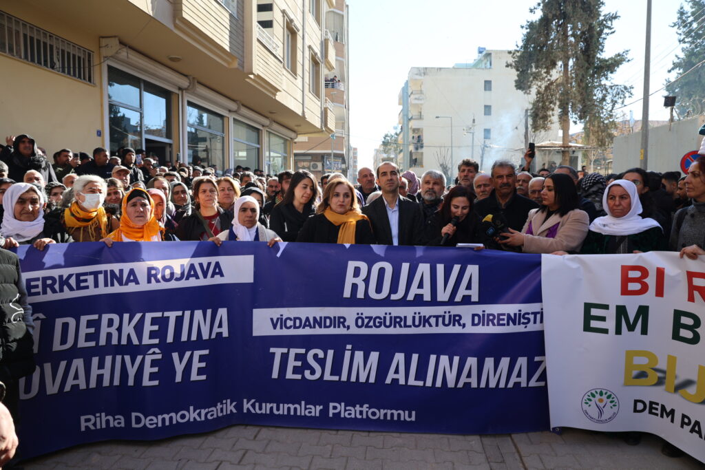 Platforma Saziyên Demokratîk a Rihayê li dijî êrişên li ser taxên Kurdan ên Helebê û Rojavayê li navçeya Pirsûsa Rihayê bi dirûşma, “Rojava hêvî ye, wijdan e: Gelê Rojava ne bi tenê ye” meşekê li dar xist. Birayê Rêberê Gelê Kurd Abdullah Ocalan Mehmet Ocalan, Hevserokê Giştî yê DBPê Keskîn Bayindir, Hevberdevka DEM Partiyê Ayşegul Dogan, hevserok û rêveberên partiyên siyasî, nûnerên saziyên civakî, Parlamenter û Hevşaredarên DEM Partiyê û bi hezaran welati tev li meşê bûn. Di meşê de pankarta “Xwedî derketina Rojava xwedî derketina mîrovahiyê” hate vekirin û dirûşmên “Bijî Berxwedana Rojava, Rojava Rojhilat e Kurdistan yêk welat e” Kujer HTŞ hevkar AKP” hate berzkirin.