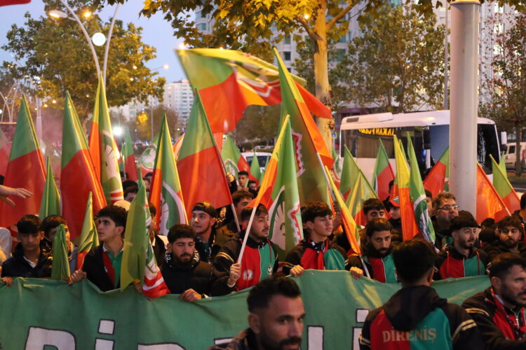 Alîgirên Amedsporê yên Koma Dîrenîşê ji ber Amedstore heta ber stadê meş li dar xistin. Alîgiran di meşê de pankart vekirin û meşaleyan pê xistin û fişekên hewayî teqandin. Alîgran bênavber dirûşm berz kirin.