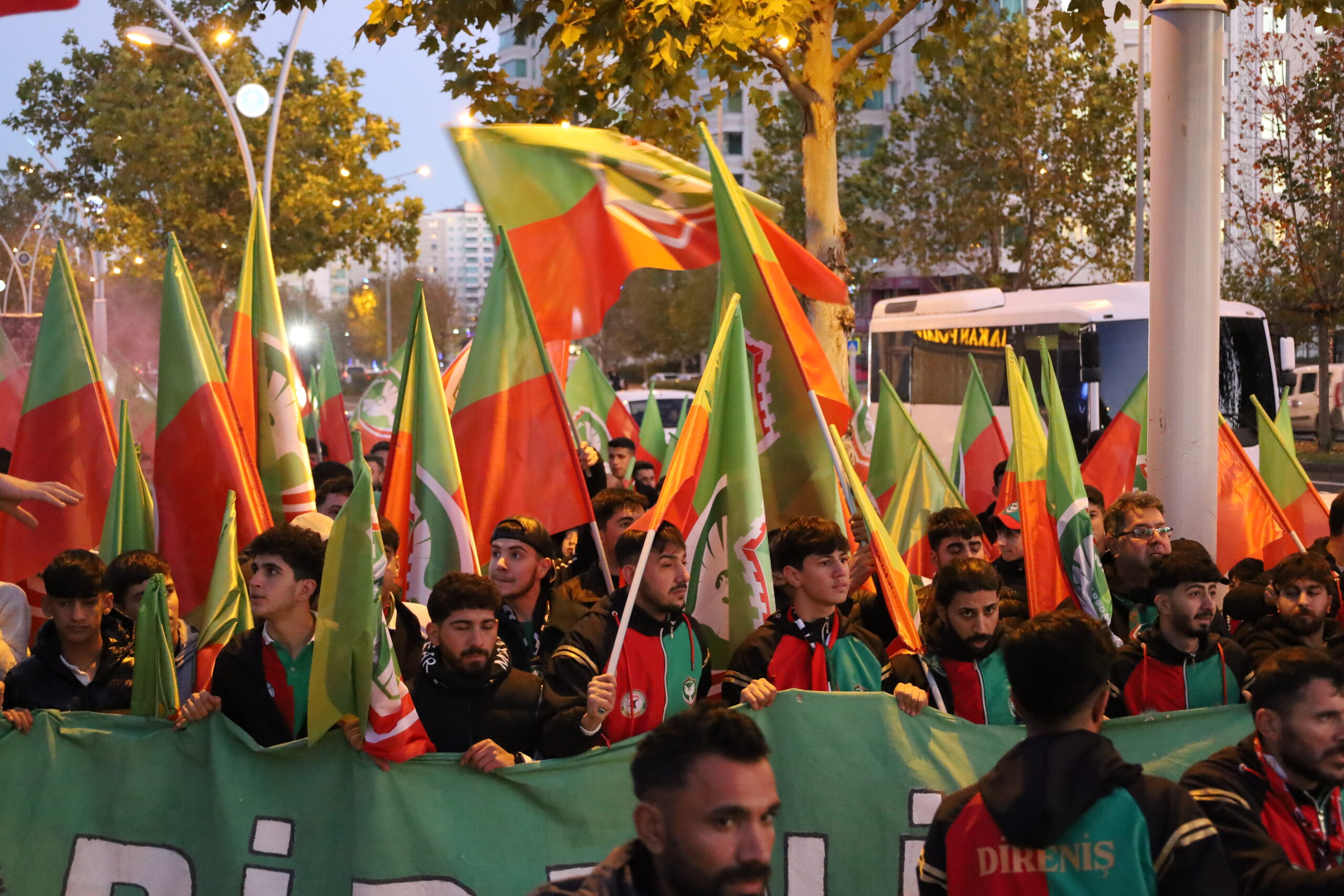 Alîgirên Amedsporê yên Koma Dîrenîşê ji ber Amedstore heta ber stadê meş li dar xistin. Alîgiran di meşê de pankart vekirin û meşaleyan pê xistin û fişekên hewayî teqandin. Alîgran bênavber dirûşm berz kirin.