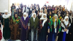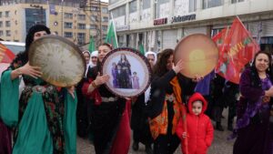 Tevgara Jinên Azad (TJA) li navçeya Geverê ya Colemêrgê bi şiara “Em bi berxwedanê azad dibin, civaka demokratîk dihûnin” 8ê Adarê Roja Jinan a Cîhanê li eywaneke li navçeyê pîroz kir. Jinên ku li ber deriyê DEM Partiyê ya Geverê kom bûn, bi cil û bergên xwe yên neteweyî û bi tilîlî û çepikan û erbaneyan, heta eywanê meşiyan. Parlamentera Colemêrgê ya DEM Partiyê Oznûr Bartin, endama Akademiya Jineolojiyê Aynûr Sarica, Dayikên Aştiyê, endam û rêveberên partiyên siyasî û saziyên civakî yên Geverê û gelek jin tev li bernameya pîrozbahiyê bûn. Li eywanê pankartên ku li ser “Sonda me kezîzerên me ne”, “Rojava rûmeta me ye”, “Yek gotin yek çalakî”, “Jin jiyan azadî” hatin daliqandin. Bernameyê ji bo kesên ku di têkoşîna azadî û demokrasiyê de jiyana xwe ji dest dane bi deqeyekî rêzgirtinê dest pê kir.