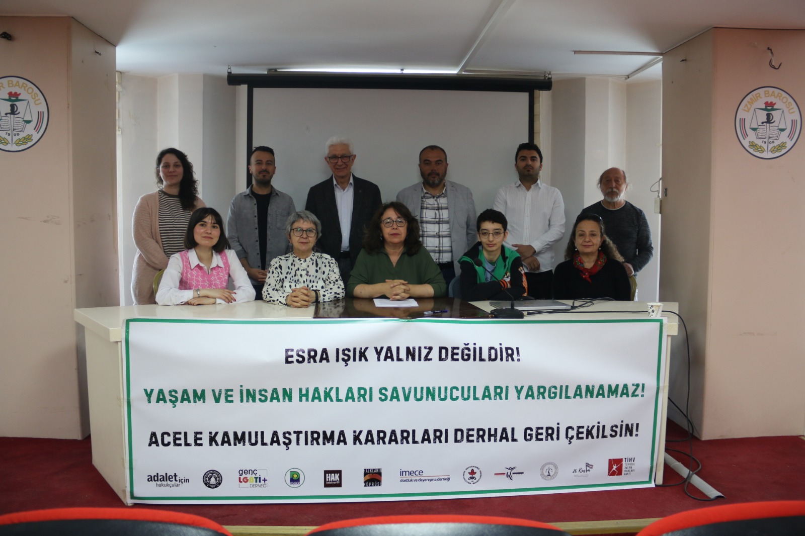 Saziyên mafên mirovan û ekolojiyê, derbarê doza ku li dijî ekolojîst Esra Işik hate vekirin û niha girtî jê tê darizandin, li Salona Konferansê ya Parêzer Tahir Elçî ya Baroya Îzmîrê daxuyaniyek dan çapemeniyê.
