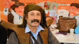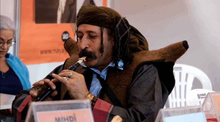 Nivîskar Şevger Çolo di Pêşengeha Pirtûkan a Amedê de bi cil û bergên xwe û bilûra xwe bala pêşengehê dikişîne ser xwe. Şevger Çolo anî ziman ku ji bo wî çand, xwendin û nivîsandina Kurdî pirr girîng e.