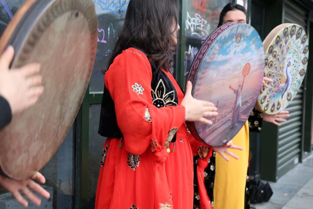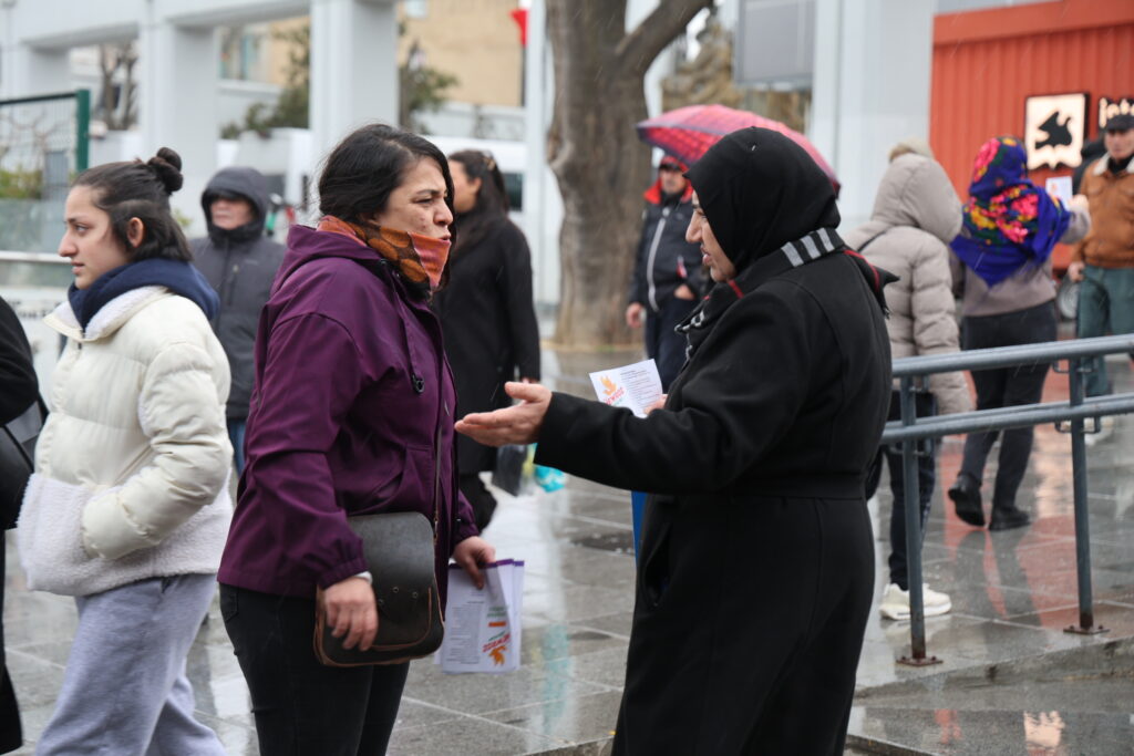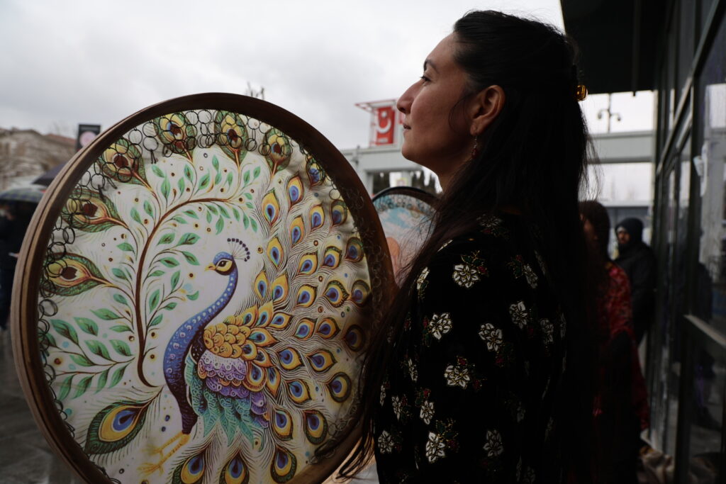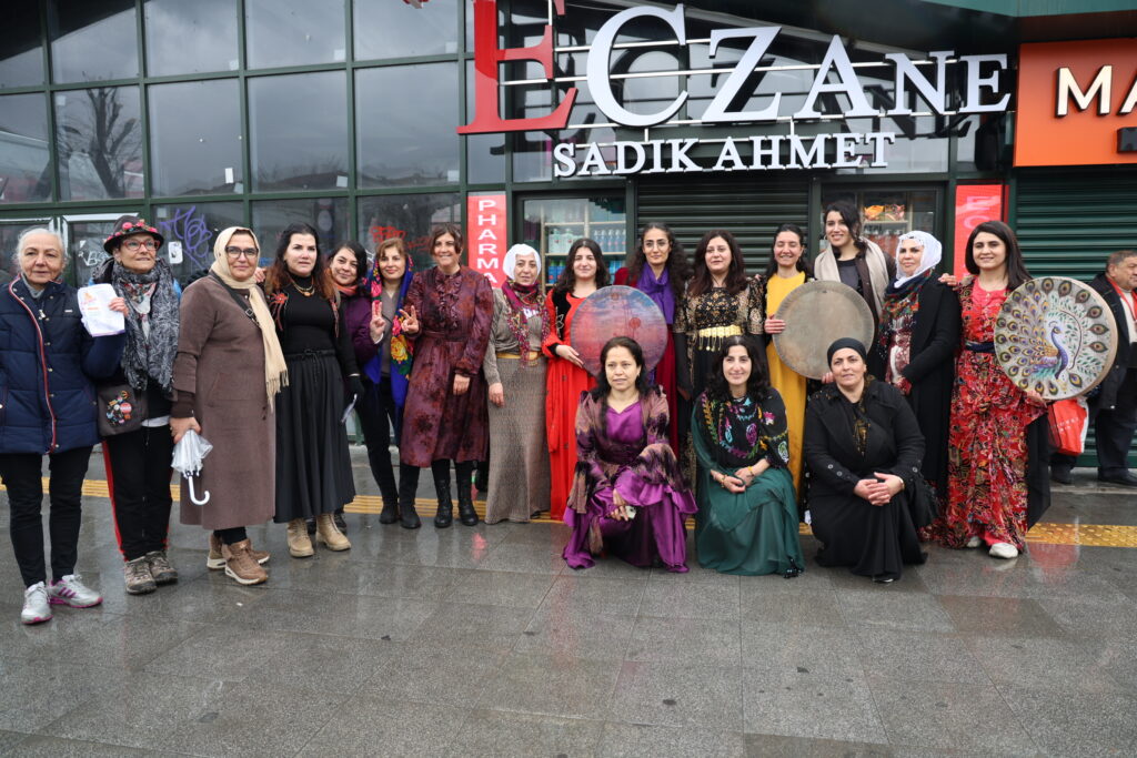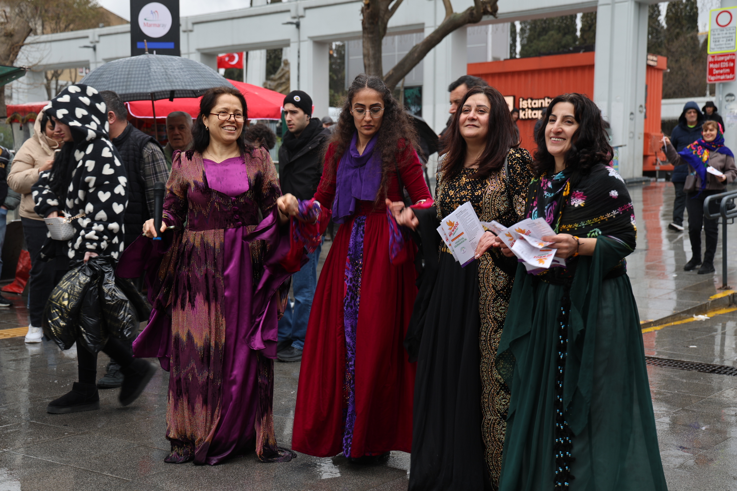 Jin bi cil û bergên xwe yên Kurdî li Qada Bakirkoyê kom bûn û dest bi meşê kirin. Jin bi erbaneyan meşiyan, stran gotin û gel vexwendin Newrozê.