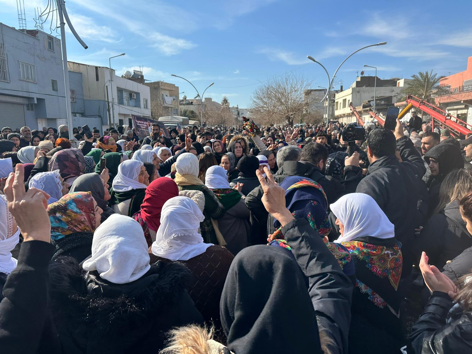 Beriya civîna Koma DEM Partiyê ya li Nisêbênê, bi hezaran welatî, ji bo êrîşên li ser Rojava şermezar bikin û li destkeftiyên Rojava xwedî derkevin, li navçeya Nisêbênê kom bûn. Girse bê navber dirûşmeyên “Bijî Berxwedana Rojava” berz dikin.