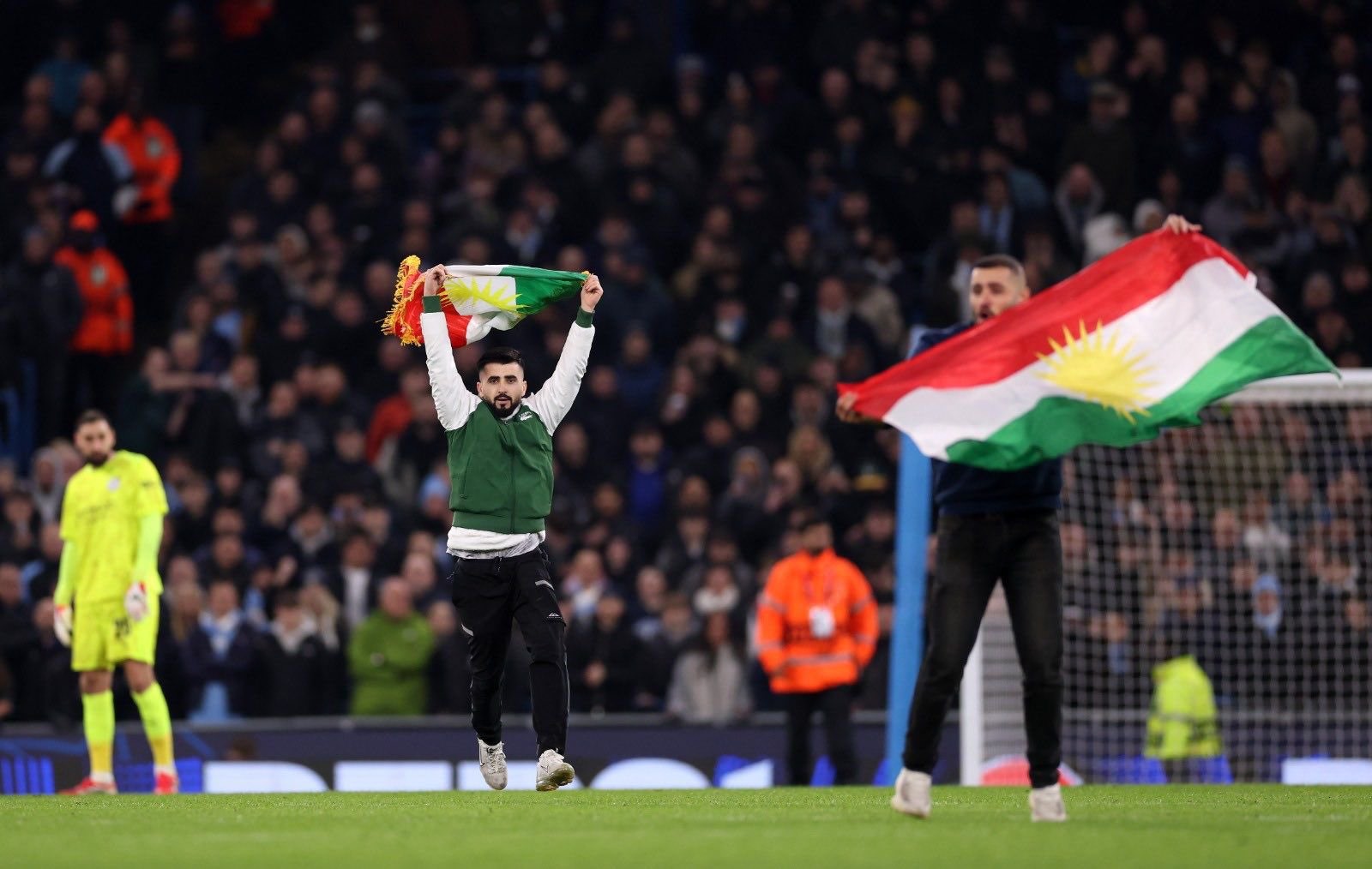 Duh êvarê li Îngîltereyê tîma Manchester City û Galatasaray hatin pêşberî hev. Di deqîqeya 50î ya maçê de sê ciwanên Kurd ketin sehê û maçê dan rawestandin. Ciwanan ku çalakî li dar xistin ala Kurdistanê vekirin û ji bo piştgiriya Rojava dirûşme ya “Bijî Kurd” berz kirin. Bi taybetî ciwanek ku bi cil û bergên Kurdî çalakî li dar dixe, bêtir balê kişand ser xwe.