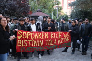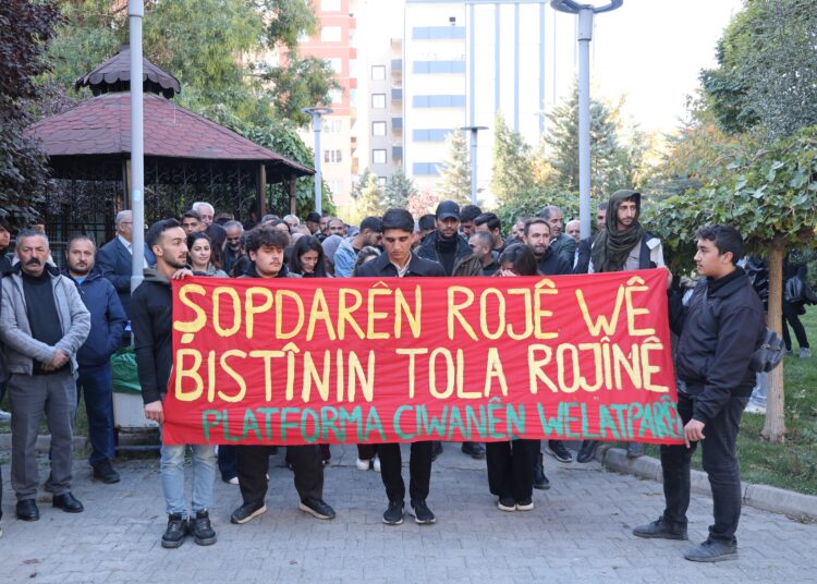 bistînin tola Rojînê” vekirin û dirûşmên “Bê Serok jiyan nabe”, “Bijî Serok Apo”, “Bi can bi xwîn em bi te re ne ey Serok” û “Ciwan fedaiyên Serok Apo ne” berz kirin. Hevserok û rêveberên Partiya Wekhevî û Demokrasiyê ya Gelan (DEM Partî) û Partiya Herêmên Demokratîk (DBP) û gelek kes ji bo piştgiriyê li parkê kom bûn.