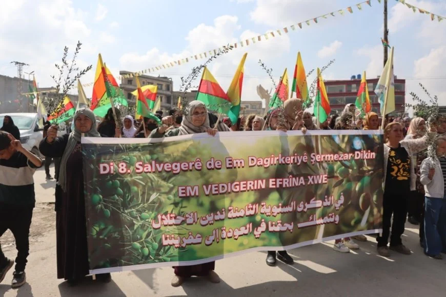 Bi boneya 8emîn salvegera dagirkeriyê bi sedan şêniyên bajarê Kobanê û koçberên Efrînê yên ku li Kobanê dijîn, daketin qadan. Girseya gel ji Qada Jina Azad li hev kom bû û heta Qada Aştiyê meşiya. Di meşê de şaxên darên zeytûnê û wêneyên Rêberê Gelê Kurd Abdullah Ocalan û alên kesk, sor û zer hatin hildan û dirûşmeya, “Bijî berxwedana Efrînê” hate berzkirin. Li Qada Aştiyê deqeyekê rêz hat girtin û dûre jî li ser navê gelê Kobanê hevserokê Desteya Jîngehê ya Kobanê Arif Balî axivî û îşaret bir ser vegera xelkê Efrînê kir. Balî wiha axivî: “Beriya 8 salan dewleta Tirk a dagirker bi balafiran dest bi êrişa ser gelê me yê Efrînê kir, li beramberî wê jî qehremanî û fedekariya gelê me, bi hêza parastinê 58 rojan li beramberî artêşeke NATO’yê û li beramberî balafiran berxwedaneke bêhempa kir. Gelê Efrînê jî li Bakur û Rojhilatê Sûriyeyê belav bû. Êdî gel dixwaze vegere ser mal û milkên xwe. Bi fikra Rêber Apo ya entegrasyona demokratîk re dê hêviya vegera li Efrînê êdî bibe rastî.”