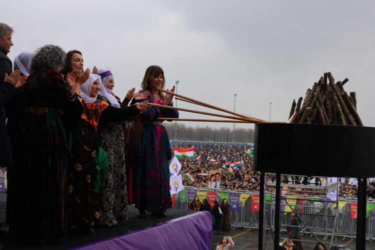 Li Stenbolê agirê Newrozê ji aliyê Dayikên Aştiyê, Hevseroka Giştî ya DEM Partiyê Tulay Hatîmogullari, Çetîn Arkaş, aktivîstên TJA Gulten Kişanak û Sebahat Tuncel û Hevdervka HDKê Meral Daniş Beştaş ve hat pêxistin.