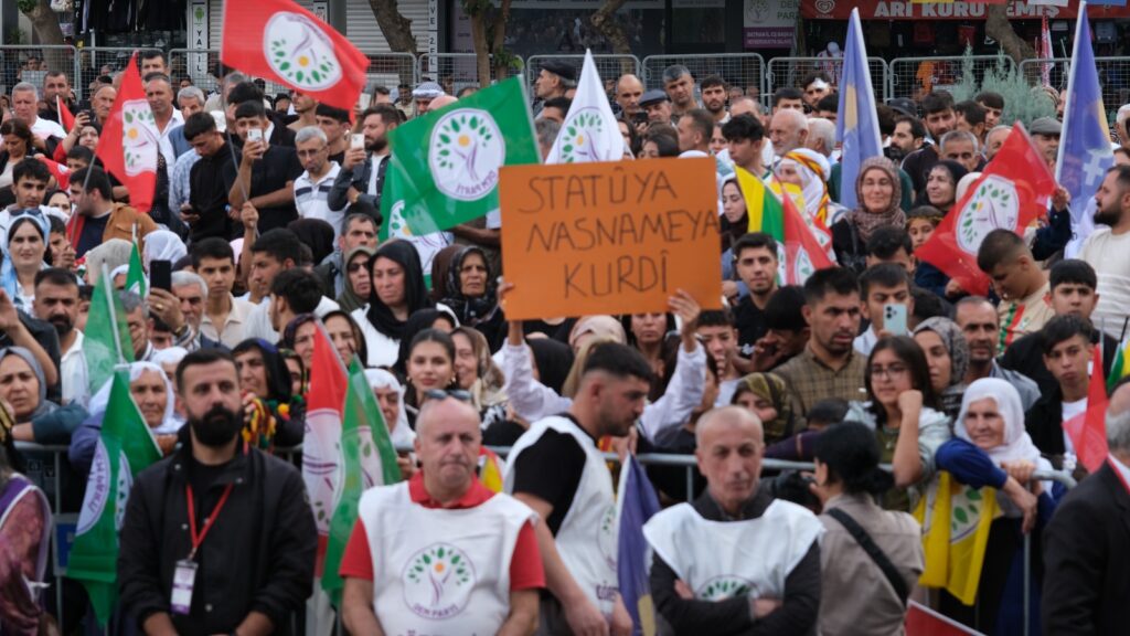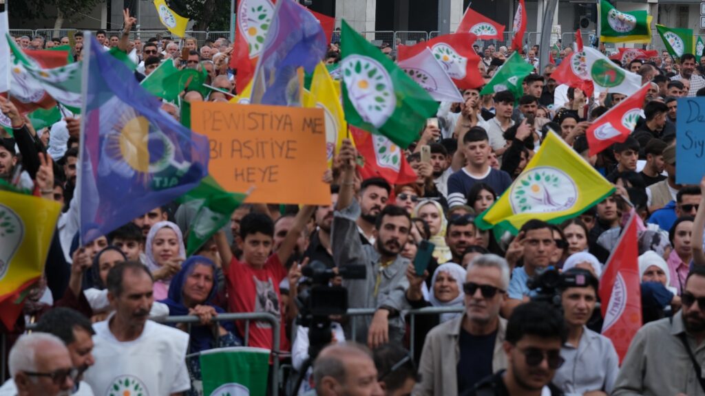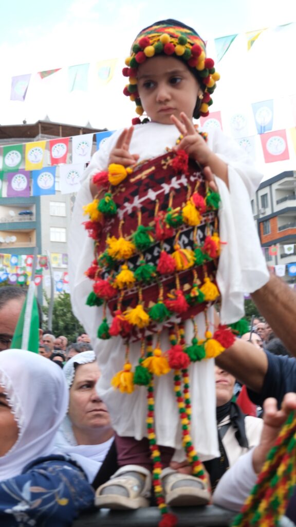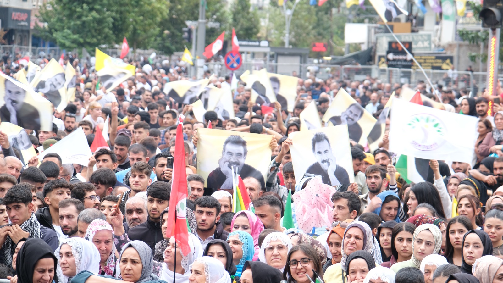 Platforma Saziyên Demokratîk li qada Çariyanê ya Êlihê mitînga “Aştî û Civaka Demokratîk” li dar xist. Bi hezaran kes di saetên zû de bi dirûşmên “Bijî Serok Apo” berz kirin û herikîn qadê. Ciwan pankarta “Ciwanên welatparêz ber bi rojê ve” vekirin û meşiyan. Jin jî bi dirûşmên “Jin Jiyan Azadî Azad Bike Rêbertî” berz kirin û pankarta “Bi Rêbertiya Azad Ber Bi Civaka Azad Ve” vekirin. Li ser dikê pankarta “Me hebûna xwe bidest xist em ê ji bo azadiyê têbikoşin” vekirin. Girseyê li qadê wêneyên Rêberê Gelê Kurd Abdullah Ocalan vekir. Hevseroka Giştî ya DBPê Çîgdem Kilicgûn Uçar, Hevberdevka Kongreya Demokratîk a Gelan (HDK) Meral Daniş Beştaş, parlamenterên DEM Partiyê û bi hezaran kes tev li mitîngê bûn.