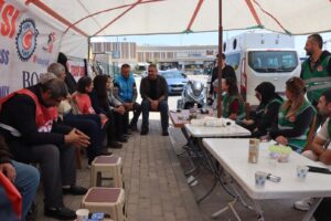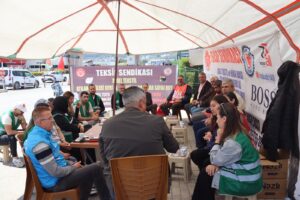 Di serdanê de Parlamentera DEM Partiyê ya Îzmîrê Burcugul Çubuk, rêveberên DEM Parti ên navçeyên Konak û Torbaliyê û nûnerên Meclisên HDKê yên Îzmîrê cih girtin. Di hevdîtinan şandeyê daxwazên karkeran guhdar kirin û peyamên piştgiriyê dan.