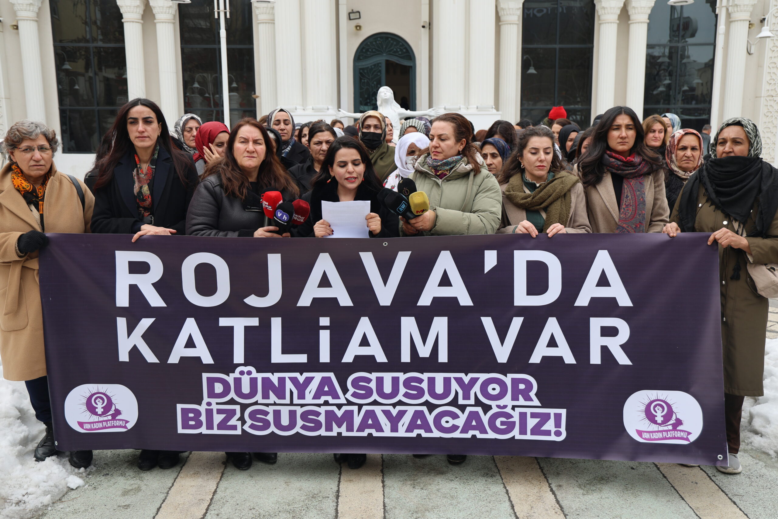 Endama Hiqûqnasên Ji Bo Azadiyê (OHD) ya Wanê Jiyan Ozkaplan ku metna daxuyaniyê xwend, bi lêv kir ku di van şerên qirêj ên li Rojhilata Navîn de tên meşandin, bedena jinan careke din veguheriye xenîmeta şer. Jiyan Ozkaplan diyar kir ku jin an bi kuştinê, an jî bi bedena xwe dibin hedef û got: “Avêtina bedena şervanên jin ên ji avahiyan, revandina jinan û qetilkirina zarokan ya bi awayekî hovane; encama rejîmeke tundiyê ye ku ne tenê leşkerî ye, di heman demê de ji aliyê serdestiya mêran ve jî kûr e. Armanca vê tundiyê tinekirina têkoşîna azadiya jinên Kurd e. Tişta ku îro li Rojava û Helebê diqewime ne şerekî leşkerî ye; êrişeke piralî ye ku armanca wê tunekirina hebûna civakî, çandî û siyasî ya gelê Kurd e. Di van êrişan de herî zêde jin û zarok dibin hedef ku mafên jiyana wan ji holê radike.”