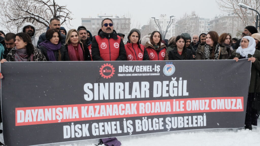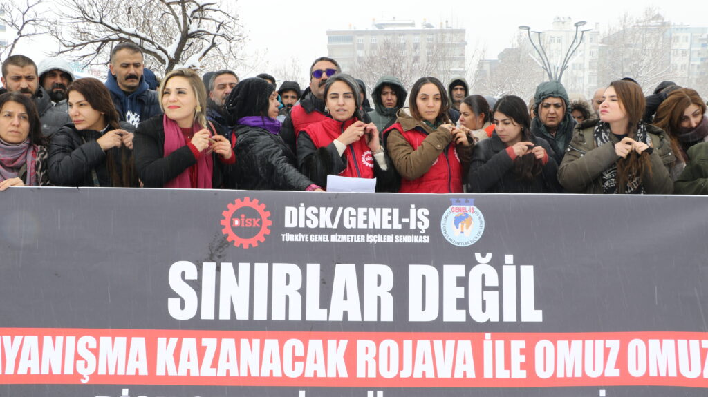 Konfederasyona Sendîkayên Karkerên Şoreşger (DİSK) û Sendîkaya Genel-Îşê derbarê êrîşên HTŞ, DAIŞ û komên paramîlîter ên Tirkiyeyê daxuyanî da. Di daxuyaniya ku li Parka Rojavayê ya navçeya Peyasa Amedê hatiye dayîn de pankarta “Ne sînor, dê piştevanî bi ser bikeve; Bi Rojava re mil bi mil “ hate vekirin. Rêveber û nûnerên şaxên sendîkayan di çalakiyê de amade bûn.