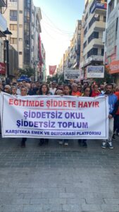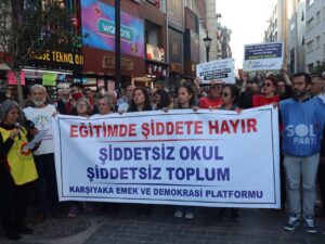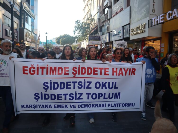 Platforma Ked û Demokrasiyê ya Karşiyakayê, ji bo êrîşên li ser dibistanên Riha û Mereşê şermezar bike, ji ber ÎZBANa Karşiyakayê heta ber dergehê çarşiyê meşiya. Di meşê de pankarta “Di perwerdehiyê de ji şîdetê re na! Dibistana bêşîdet, civaka bi rûmet” hat hildan û dirûşmên “Yûsûf Tekîn ê wezîrê terîqetan îstifa”, “Dibistana ewle, pêşeroja ewle” û “Em teslîmî tarîtiyê nabin” hatin berzkirin.