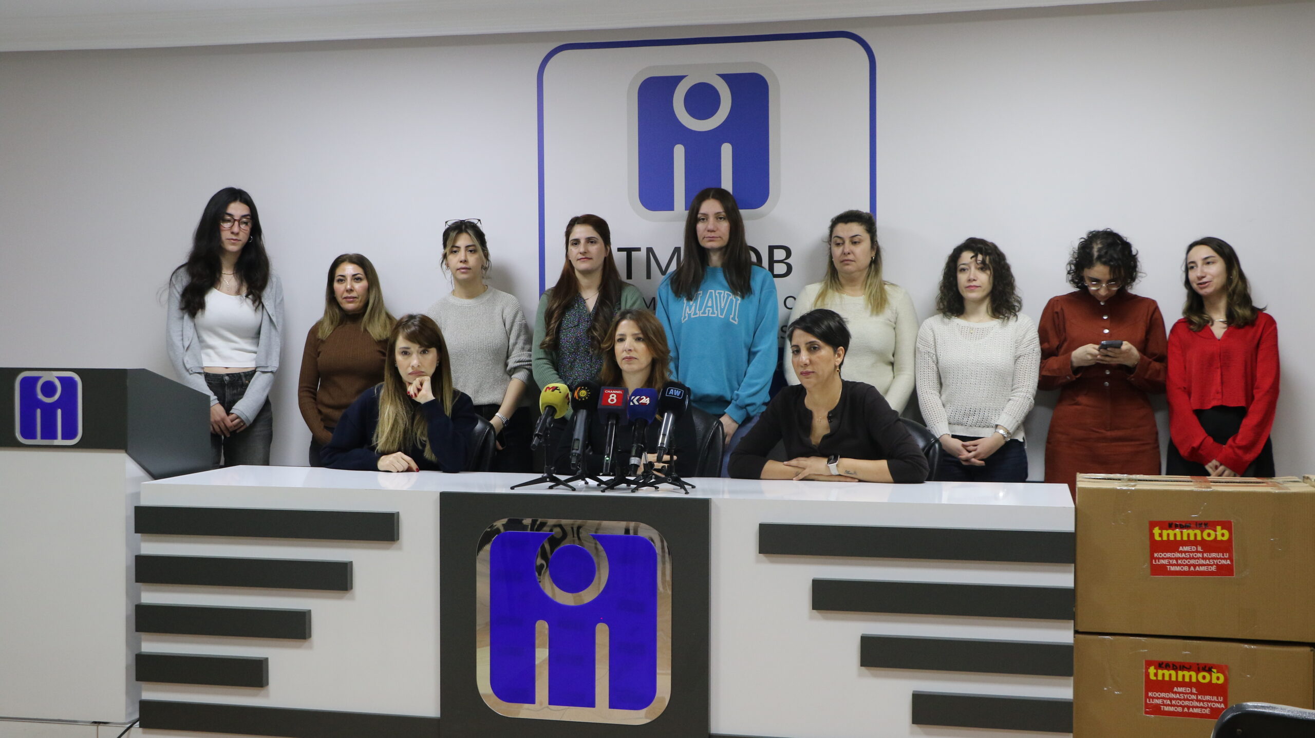 Lijneya Koordînasyona Bajêr a Amedê ya Yekîtiya Odeyên Avahîsaz û Endezyaran a Tirk (TMMOB) bi dirûşma “Piştgiriya Bi Jinên Kobanê re. Bi ruhê berxwedanê yê 8ê Adarê em jiyanê diparêzin” li avahiyê Şaxa Endezyarên Înşaatê ya li navçeya Yenîşehîrê ya Amedê daxuyanî da çapemeniyê. Endam û rêveberên TMMOBê û gelek kes tev li daxuyaniya çapemeniyê bûn. Metna daxuyaniyê ya bi Tirkî Hevseroka Odeya Endezyarên Madenê Zeynep Ogûzê xwend.