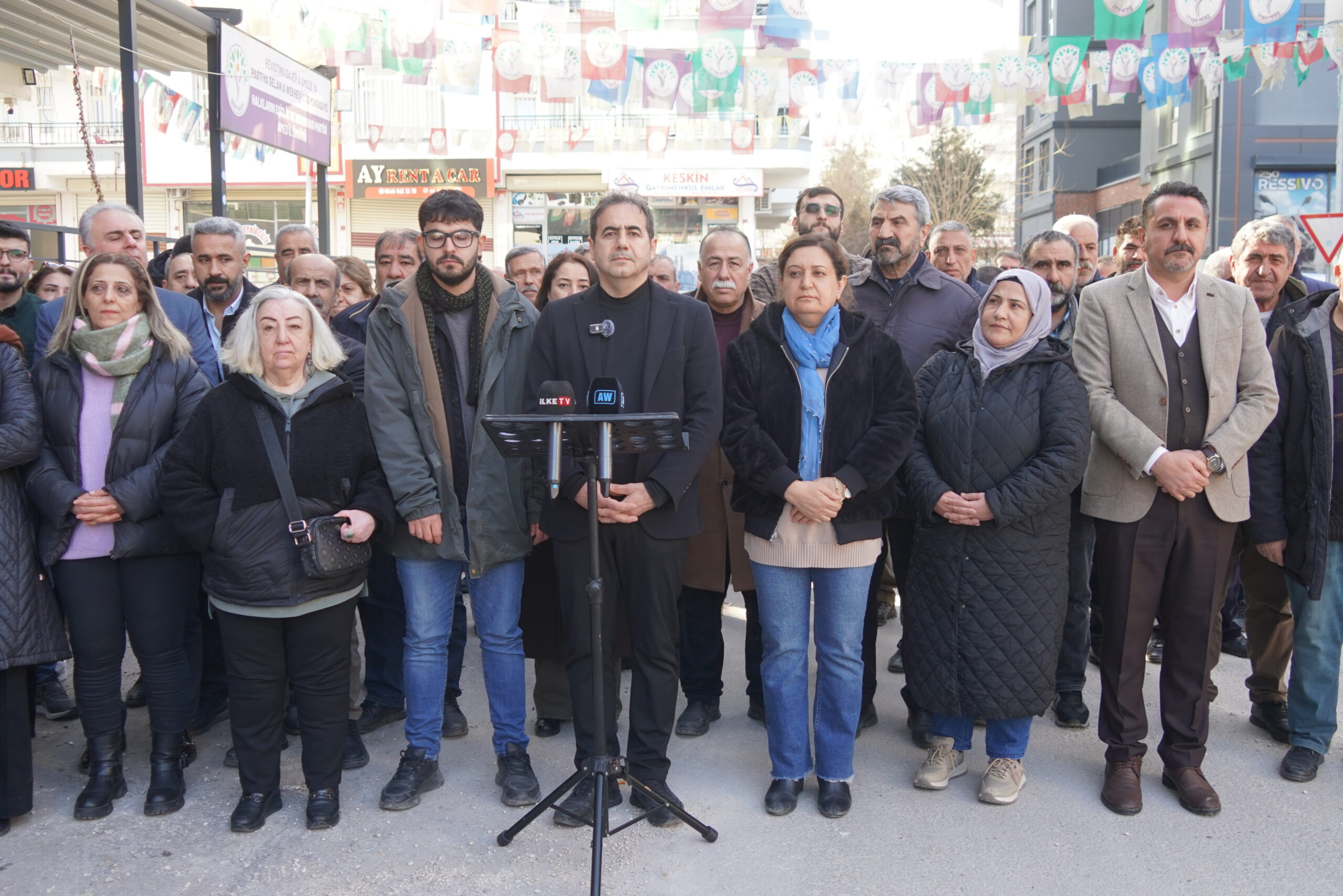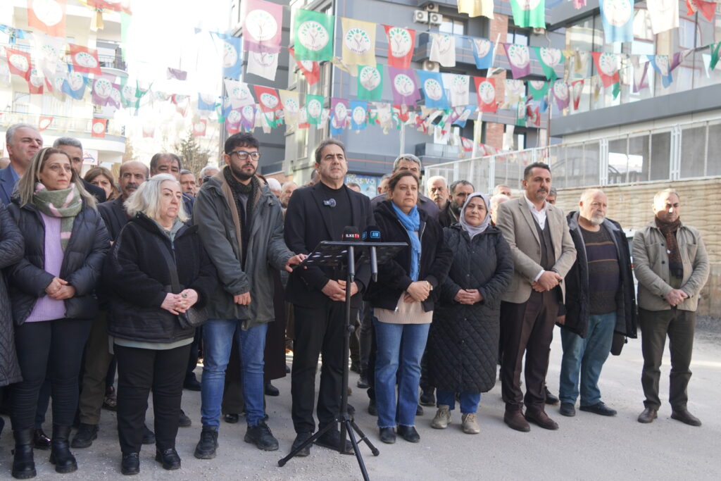 DEM Partî û endamên Partiya Sosyalîst a Bindestan (ESP) ya Amedê li avahiya DEM Partiyê ya navçeya Peyasê têkildarî êriş û operasyonên li dijî ESPê daxuyanî dan çapemeniyê. Endam û rêvebirên her dû partiyan tevlî daxuyaniyê bun.