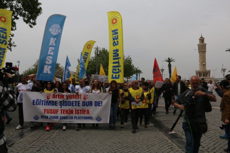 Meş li li ber Midûriyeta Perwerdeya Neteweyî ya Îzmîrê bi dawî bû û daxuyaniya çapemeniyê hat dayîn. Di daxuyaniyê de pankarta “Êdî bes e, ji tundiya di perwerdeyê de re bibêje raweste, Yusuf Tekin îstifa bike” hate vekirin; her wiha dirûşmên “Wezîrê sermayeyê Yusuf Tekin bila îstifa bike”, “Em ê teslîmî tarîtiyê nebin” û “Heke tundî hebe xizmet tune ye” hatin berzkirin. Serokê Şaxa Egîtîm Senê ya Hejmara 1ê ya Îzmîrê Hamdî Çalik ve hate xwendin.