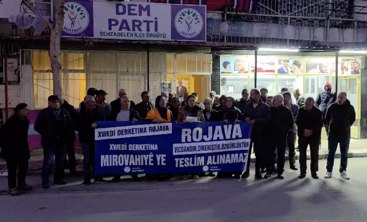 Girseya ku li ber avahiya Navçeya Şehzadelerê ya DEM Partiyê kom bû, bi pankartên “Xwedîderketina Rojava, xwedîderketina mirovahiyê ye” û “Rojava wijdan e, berxwedan e, azadî ye” li hember êrişên li ser taxên Şêxmeqsûd û Eşrefiyeyê yên Helebê bertek nîşan da.