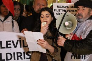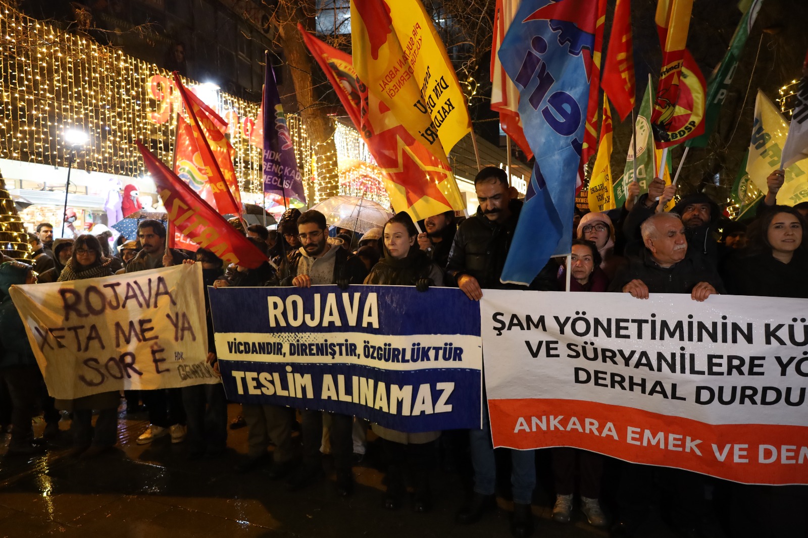 Platforma Saziyên Demokratîk, li dijî êrîşên komên hikûmeta Şamê li ser taxên Şêxmeqsûd û Eşrefiyê yên Helebê li kolana Yukselê ya navçeya Çankaya ya Enqereyê daxuyanî da. Parlamenterên Partiya Wekhevî û Demokrasiyê ya Gelan (DEM Partî), endam û nûnerên partiyên siyasî û saziyên demomratîk tevlî daxuyaniyê bûn. Di daxuyaniyê de pankarta “Rojava xeta me ya sor e”, “Rojava azadiyê, teslîm nayê girtin” dinivisî hat hilgirtin. Girsê di daxuyaniyê de bênavber dirûşmeyên, “Kurdistan dê ji faşistan re bibe goristan“, “Bijî berxwedana Rojava”, “Kujer Colanî hevkar AKP”, “Her der Rojava û her der berxwedan e” û “Bijî wekheviya gelan” berz kirin.