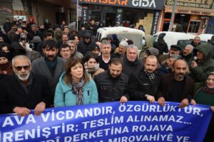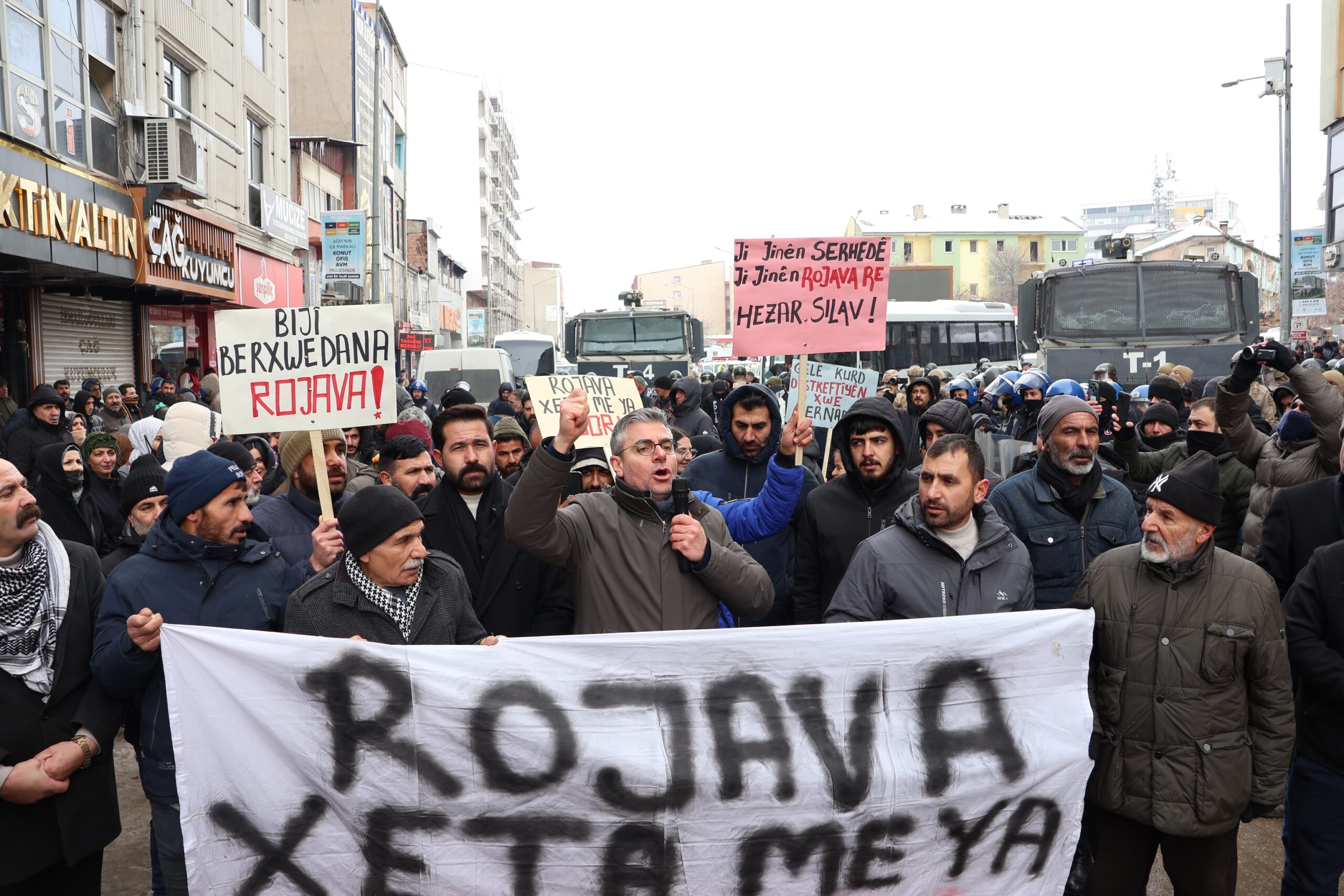 Li navçeya Bazîd a Agiriyê, polîsan rê li ber girseya ku ji bo protestokirina êrîşên li ser Rojava meşiya, girt. Piştî astengkirina meşê, girse kom bû û bi dirûşmeyan nerazîbûn nîşan da. Parlamenterê DEM Partiyê Heval Bozdag li cihê kombûnê daxuyaniyek da. Heval Bozdag diyar kir ku êrişên li ser Rojava ne tenê gelê Kurd, lê di heman demê de pêşeroja hemû gelên herêmê jî hedef digire û got ku ev êriş ji hêla polîtîkayên hêzên navneteweyî û dewletên herêmî ve kûrtir dibin. Bozdag bi bîr xist ku gelê Rojava bi salan li dijî DAIŞê ji bo mirovahiyê bedelên giran daye û got: “Îro li Rojava tiştê ku tê hedefgirtin îradeya hevpar û wekhev a gelan e. Armanca van êrîşan tunekirina destkeftiyên gel e.”