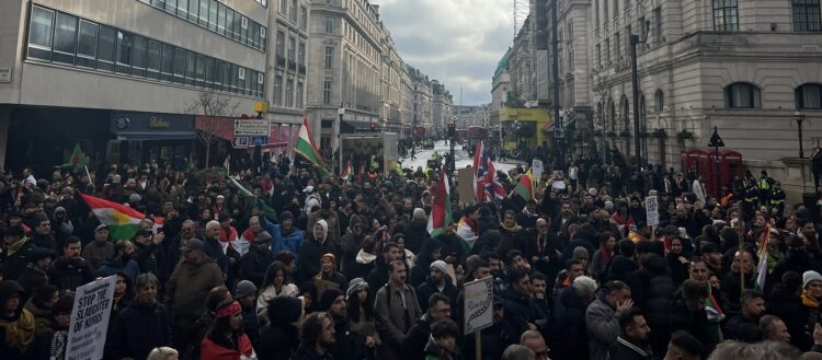 Li Ingilîstanê jî bi hezaran kes li paytext Londrayê ji bo piştgiriya Rêveberiya Xweser kom bû. Girseya li ber avahiya saziya weşangeriyê ya Ingilîstanê BBCyê hate cem hev, êrişên li ser Rojava şermezar kirin. Bi mitîngê di heman demê de peyam ji weşangeriya BBCyê re jî hate nîşan dan. Girseya li vir kombûyî al û rengên Kurdistanî bilind kirin. Girseyê ji vir dest bi pankartên wekî, “Bijî berxwedana Rojava”, “Rojava biparêz e” vekirin û sloganên, “Rojava Rojhilat e, Kurdistan yek welat e”, “Jin jiyan azadî”, “Bijî berxwedana Rojava” dest bi meşê kir. Di axaftinên li vir hatîn kirin de polîtîkayên Ingilîstanê yên piştgiriyê didin HTŞ û DAIŞê hatin protestokirin. Her wiha sedema êrişên li ser Rojava tên meşandin jî wekî komployek navdewletî hate pênasekirin. Ji bo vala derxistina komployê û parastina Rojava bang li tevahiya gelê Kurd û mirovahiya pêşverû hate kirin. Di dema meşê girseyê belavokên li ser armanc û sedemê êrişan amade kirîn, li welatiyan belav kirin.