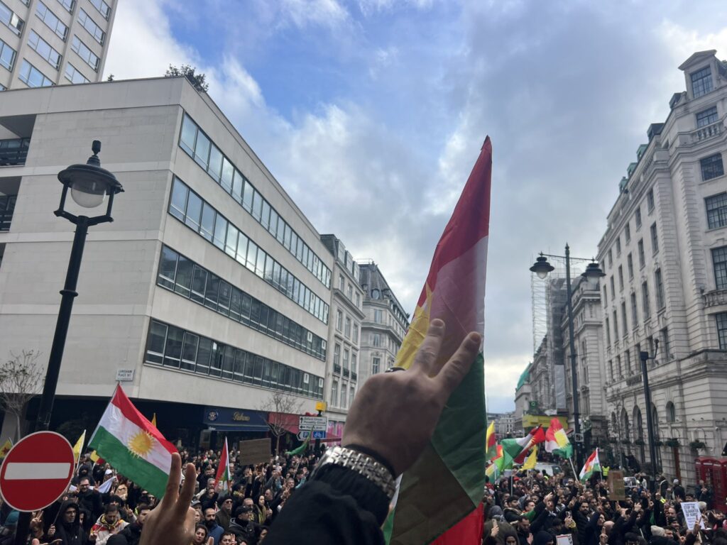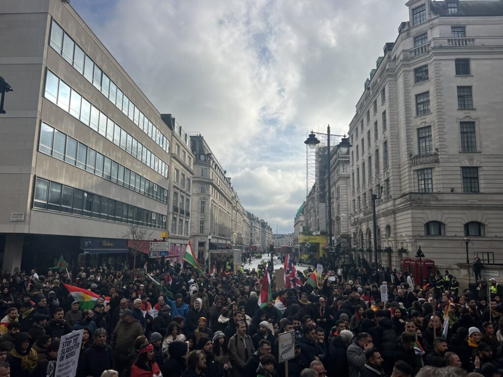 Li Ingilîstanê jî bi hezaran kes li paytext Londrayê ji bo piştgiriya Rêveberiya Xweser kom bû. Girseya li ber avahiya saziya weşangeriyê ya Ingilîstanê BBCyê hate cem hev, êrişên li ser Rojava şermezar kirin. Bi mitîngê di heman demê de peyam ji weşangeriya BBCyê re jî hate nîşan dan. Girseya li vir kombûyî al û rengên Kurdistanî bilind kirin. Girseyê ji vir dest bi pankartên wekî, “Bijî berxwedana Rojava”, “Rojava biparêz e” vekirin û sloganên, “Rojava Rojhilat e, Kurdistan yek welat e”, “Jin jiyan azadî”, “Bijî berxwedana Rojava” dest bi meşê kir. Di axaftinên li vir hatîn kirin de polîtîkayên Ingilîstanê yên piştgiriyê didin HTŞ û DAIŞê hatin protestokirin. Her wiha sedema êrişên li ser Rojava tên meşandin jî wekî komployek navdewletî hate pênasekirin. Ji bo vala derxistina komployê û parastina Rojava bang li tevahiya gelê Kurd û mirovahiya pêşverû hate kirin. Di dema meşê girseyê belavokên li ser armanc û sedemê êrişan amade kirîn, li welatiyan belav kirin.