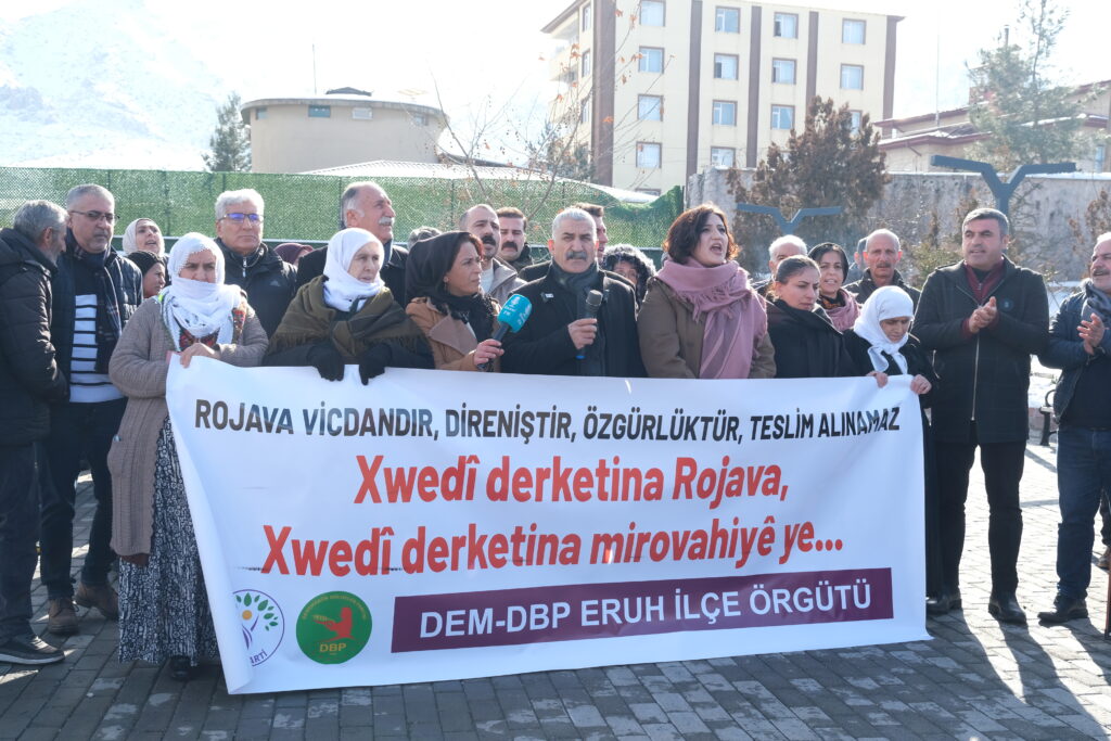 Girseya ku li pêş avahiyên xwe kom bûn, li dijî êrişên li ser rojavayê Kurdistanê heta qada cumhuriyetê meşiyan. Piştî meşê daxuyanî dan çapemeniyê. Di çalakiyê de parlamentera DEM Partiyê ya Sêrtê Sabahat Erdogan Saritaş, nûnerên rêxistinên DEM Partiyê û DBPê, TJA, Hevşaredarên DEM Partiyê yên Sêrtê û gelek endamên saziyên civaka sivîl, gelek kes tev li çalakiyê bûn. Girseyê di meşê de diruşmeyên “Bijî berxwedana Rojava “, “Yek e yek e yek e Kurdistan yek e”, “Kurdistan Kürdistan gora faşîstan”, “Bijî berxwedana QSDê” û “Bijî berxwedana YPGê” berz kirin. Dîsa di meşê de pankar hilgirtin. Hevserokê DEM Partiyê yê navçeya Dihê Mahfûz Atabay li vir daxuyanî xwend û êrîş şermezar kir.