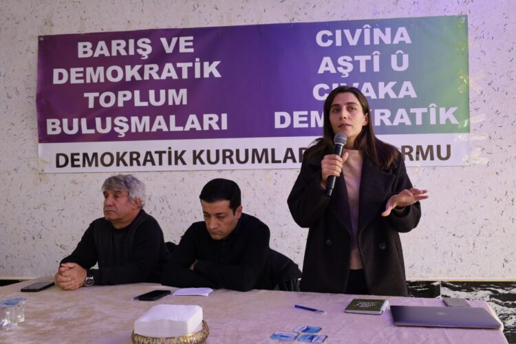 Civînê bi deqeyekê rêzgirtinê dest pê kir û ewilî Gulistan Sonuk axivî. Gulistan Sonukê girîngiya pêkanîna civakeke aştîxwaz û demokratîk anî ziman û got: “Tiştê ku di vê pêvajoyê de divê were kirin avakirina komun û meclisan e. Ger avakirina van komun û meclisan ji hêla jin û ciwanan ve neyê rêvebirin, ew ê zû bikevin xizmeta pergalê. Ev ji me re ji bilî koletiyê û hilweşînê tiştekî nayne. Belê, îro danûstandin ji bo aştiyê têne kirin. Li aliyekî Rêber Apo weke muzakerevanê sereke heye û li aliyê din jî dewlet bi xwe heye. Di vê pêvajoyê de, karê me yê sereke avakirina civaka aştîxwaz û demokratîk e. Çima em ewqas girîngiyê didin civaka aştîxwaz û demokratîk, an çima em ewqas girîngiyê didin komun û meclîsan? Ji ber ku ger em, wekî gelê Kurd, rêveberiyên xwe ava nekin, ger em xwe rêxistin nekin, em ê di nav pergalê de bihelin. Em bawer dikin ku bingeha parastina xwe ne li ser çekan e, lê li ser siyaseta demokratîk e.”