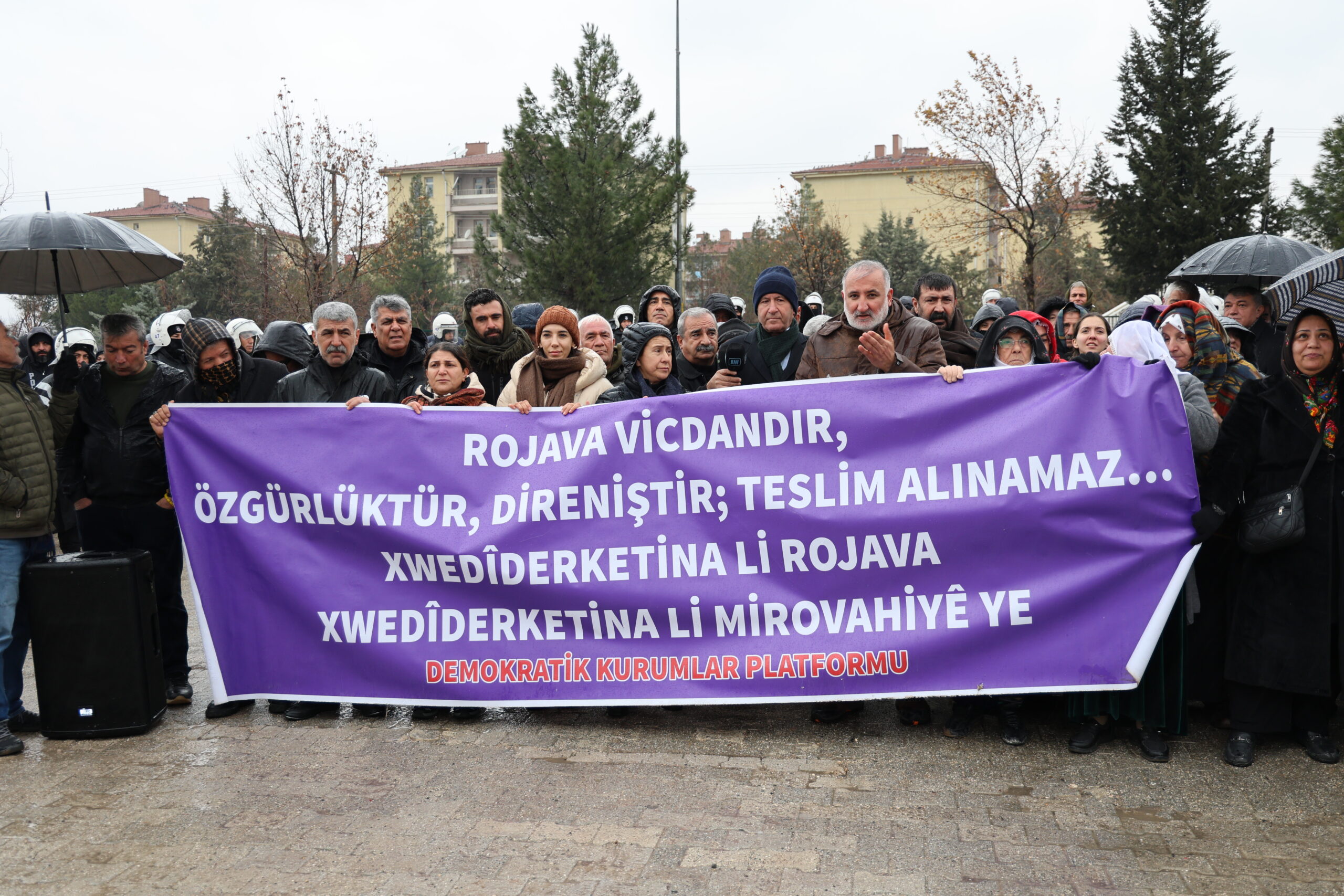 Platforma Saziyên Demokratîk a Mêrdînê têkildarî êrişên li dijî Rojava li Taxa Îstasyonê ya navçeya Artûklû ya Mêrdînê daxuyanî da çapemeniyê. Parlamenterê DEM Partiyê yê Mêrdînê George Aslan, endam û rêveberên partiyên siyasî û saziyên sivîl ên civakî di nav de gelek kes beşdarî daxuyaniyê bûn. Girseya ku pankarta “Rojava berxwedan e, azadî ye, wijdan e, nikare teslîm bê girtin. Xwedîderketina li Rojava Xwedîderketina li Mirovahiyê ye” hilgirt tevî barîna barana zêde dirûşmên “Bijî berxwedana Rojava” û “Rojava rûmeta me ye” berz kir û daxuyanî da.