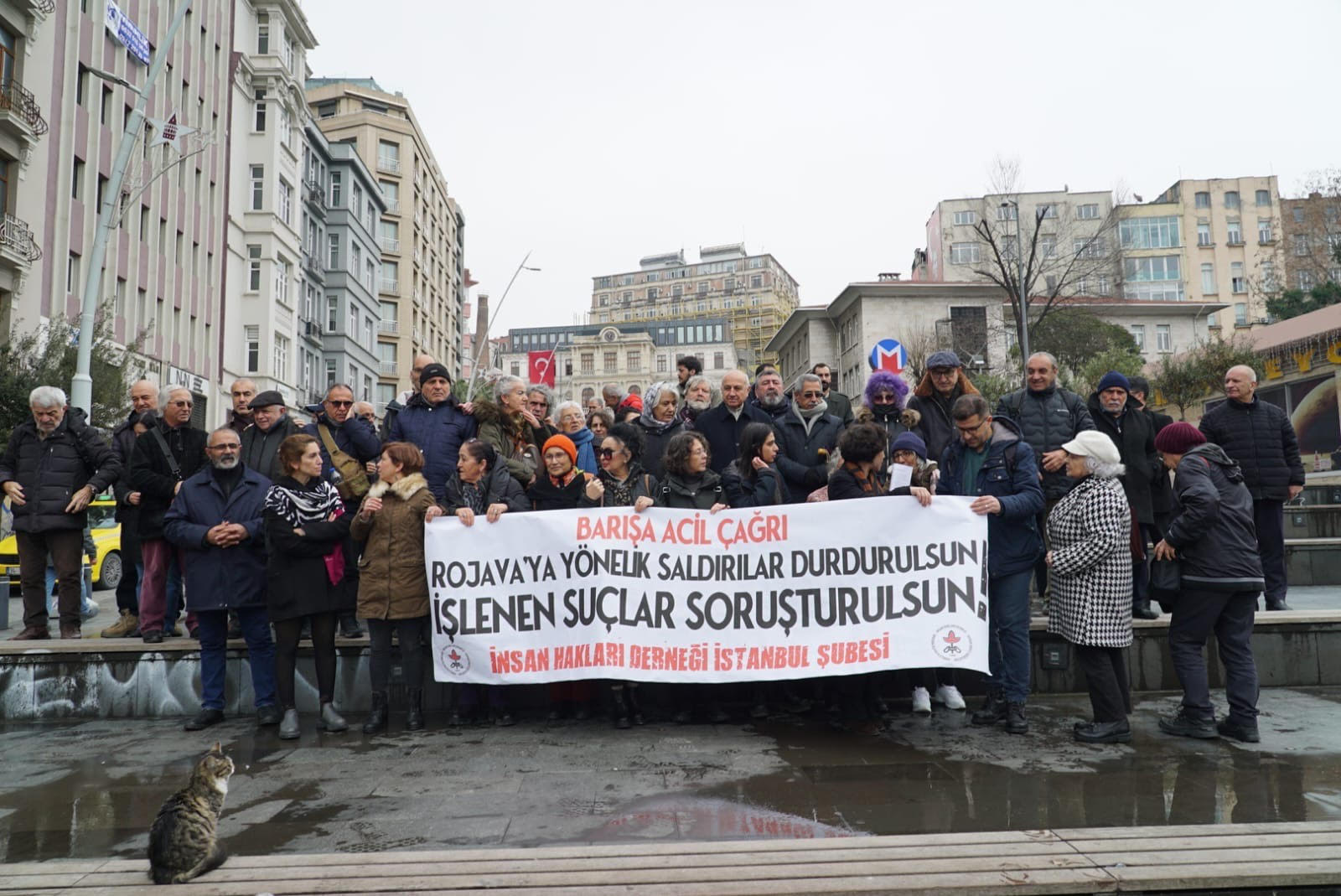 Şaxa Komaleya Mafê Mirovan (ÎHD) a Stenbolê li Qada Şîşhaneyê ya navçeya Beyogluyê ji bo rawestina êrişên ser Rojava daxuyanî da. Daxuyaniyê Serokê şaxa ÎHDê ya Stenbolê Jiyan Tosun xwend.