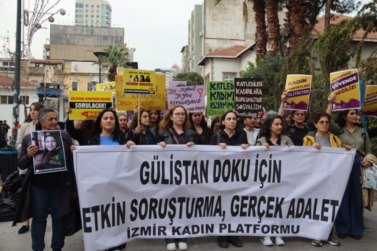 Platforma Jinan a Îzmirê (ÎKP), têkildarî dosyaya Gulistan Doku ya ku di 5ê çileya 2020an de li Dêrsimê hatibû windakirin, li ber avahiya Avahiya Navenda Pivan, Bijartin û Bicîhkirinê (OSYM) ya li Alsancakê ya Îzmîrê daxuyaniyeke çapemeniyê pêk anî. Jinên ku li wir kom bûn, bi pankarta “Ji bo Gulistan Doku lêpirsîna çalak, edaleta rastîn” ber bi Navenda Çandê ya Turkan Saylan ve meşiyan.