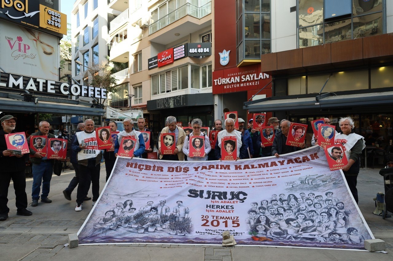 Înîsiyatîfa Malbatên Pirsûsê, di meha 129an a Komkujiya Pirsûsê de li ber Navenda Çandê ya Turkan Saylan a li Alsancakê daxuyaniyek da çapemeniyê. Di daxuyaniyê de pankarta ku wêneyên kesên di komkujiyê de jiyana xwe ji dest dane hat vekirin.