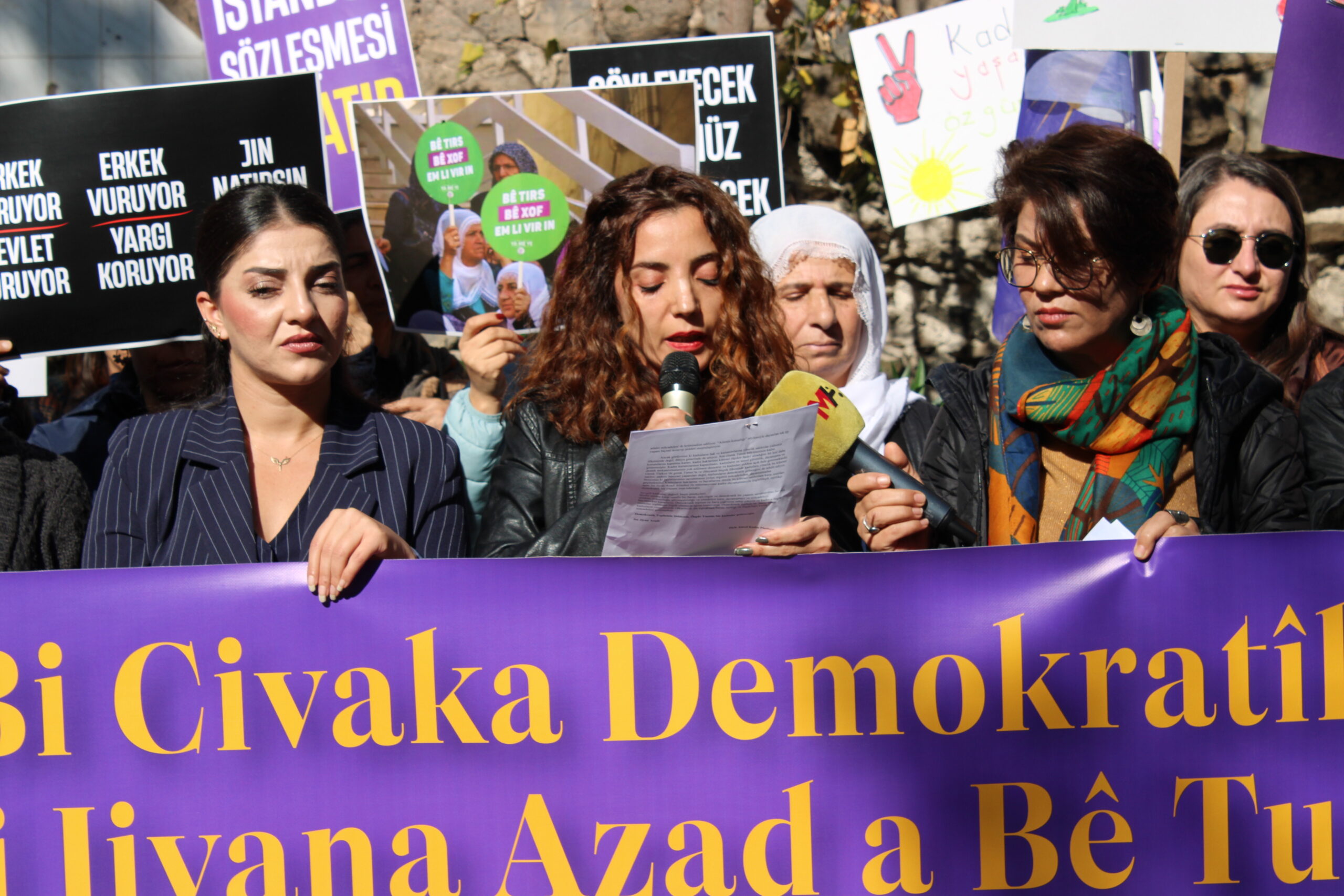 Hevseroka Sendîkaya Kedkarên Buroyê Guneş Ozel metna daxuyaniyê ya bi Tirkî xwend û wiha got: “Em ê li hember van êrîşên li ser maf û jîyana jinan bi felsefeya Jin Jîyan Azadî ku sînoran nas nake, têbikoşin. Em ê bi hevgirtina jinan ya enternasyonal jîyaneke azadîxwaz, wekhevîxwaz û demokratîk ava bikin.”