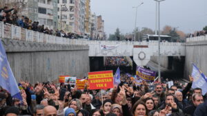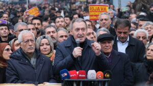 Hevserokê Giştî yê DEM Partiyê Tuncer Bakirhan li vir axivî û diyar kir ku beriya 15 salan, di rojeke wekî îro de, pêleke tarî ya zilmê destpêkê Rojhilata Navîn û piştre cîhan girtibû bin bandora xwe û wiha got: “Li Sûriyeyê, li Rojava; jinên Kurd, şoreşger ew tariya ku cîhan li ber wê teslîm bûbû bi têkoşîna xwe, bi berdêla can û xwîna xwe bi dawî kirin. Rojava azad kirin. Cîhan ji belaya tarî ya DAIŞê rizgar kirin. Vaye ew şoreş, ew şoreşa jinan, ew şoreşa berxwedanê, ew şoreşa Rojava îro xwe berz kir. Xwestin ku li Helebê bidine tepisandin lê nikaribûn. Li Şêxmeqsûd û Eşrefiyeyê çete, hêzên rejîmê û hêzên paramîlîter xwestin wê şoreşa Rojava ya ku cîhanê rêz jê re girtibû û îlan kiribû, ji holê rakin. Lê tiştek ji bîr kirin: Duhok, Zaxo, Silêmanî, Wan, Amed, Sêrt, Qers û Îzmîr… li pişta Rojava bû. Berxwedan û piştevaniya gelan û Kurdan ji bîr kirin. Hûn ji vê saetê şûn ve nikarin bi milyonan gelê Kurd bêstatu bihêlin.”