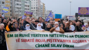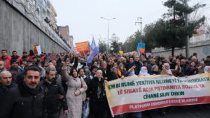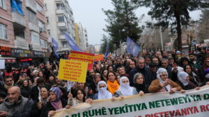 Meşê ji ber Bîrdariya Mafên Jiyanê ya li Parka Koşuyolû dest pê kir. Di meşê de girseyê bênavber dirûşmeyên “Bijî Serok Apo”, ”Yek e yek e gelê Kurd yek e”, “Şehîd namirin”, “Bijî berxwedana Rojava” û “Rojava Rojhilat e Kurdistan yek welat e” hatin berzkirin. Pankartên “Xwedîderketina li Rojava, xwedîderketina li mirovahiyê ye”, “Em bi ruhê yekîtiya neteweyî ya demokratîk 1ê Sibatê Roja Piştgiriya Rojava ya Cîhanî silav dikin” hatin vekirin. Di meşê de dowîzên, “Berxwedan bi honandina keziyên jinan dest pê dike”, “Her keziyek hêvî û azadiyê dihewîne” û gelek dowîzên din hatin rakirin.