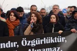 Girseya ku li Xaçerêya Îstasyonê kom bû, daxuyanî da. Hevseroka Partiya Wekhevî û Demokrasiyê ya Gelan (DEM Partî) ya Mûşê Çîçek Tûtûş daxuyanî da û diyar kir ku êrîşên li ser Rojava aştiya tevahî herêmî tehdît dikin û xwest ku ev êriş tavilê werin rawestandin.