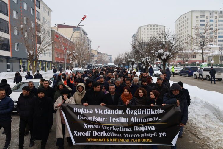 Platforma Saziyên Demokratîk a Muşê li dijî êrişên li ser Rojava meşiya û daxuyanî da. Gelek welatî li ber Kolana Îstasyonê kom bûn û bi çepik û dirûşmeyan dest bi meşê kirin. Pankartek bi nivîsa “Rojava wîjdan e, azadî ye, berxwedan e, kes nikare teslîm bigire” hate vekirin. Bi sedan kes meşiyan û dirûşmeyên wekî “Rojava rûmeta gelê Kurd e” û “YPG gel e, gel li vir e” qîr kirin.