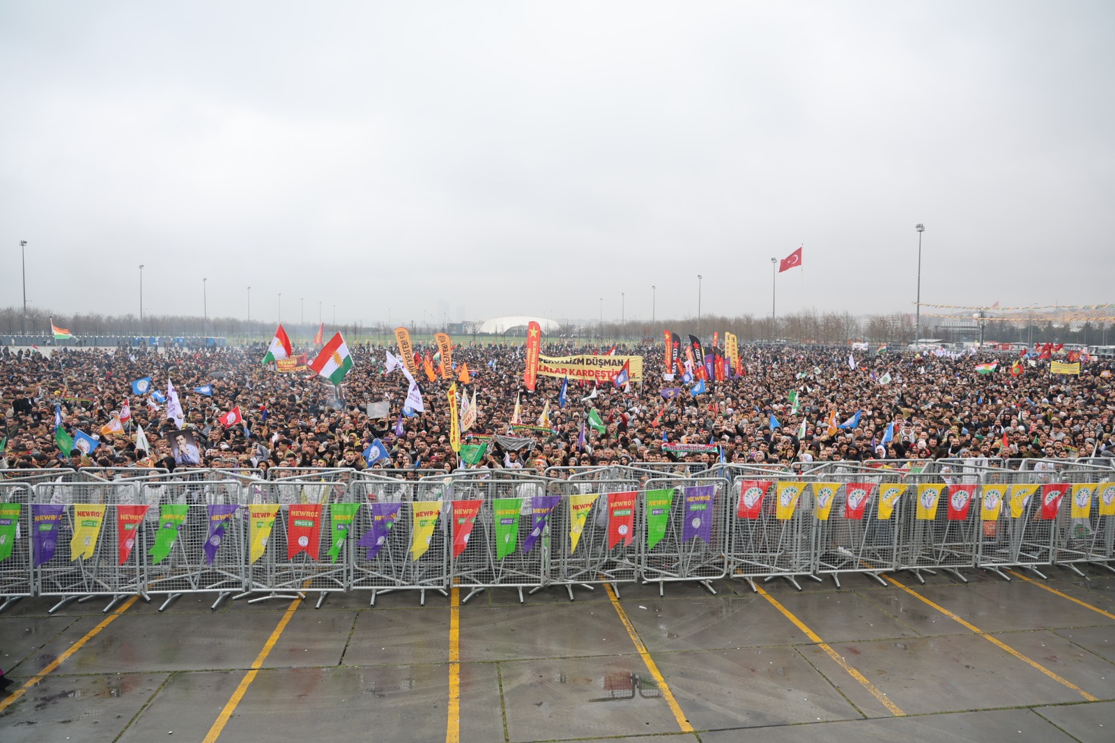 Girseya li qada Newrozê bê navber dirûşmeyên, “Bijî Serok Apo”, “Bê Serok jiyan nabe”, “Jin jiyan azadi” û “Yek e yek e yek e Kurdistan yek e” berz kir. Piştre jî komîteya amadekar li ser dikê girseyê silav kir. Hevserokên DEM Partiya Stenbolê Arîfe Çinar û Çinar Altan jî girse silav kirin û axaftineke kurt kirin.