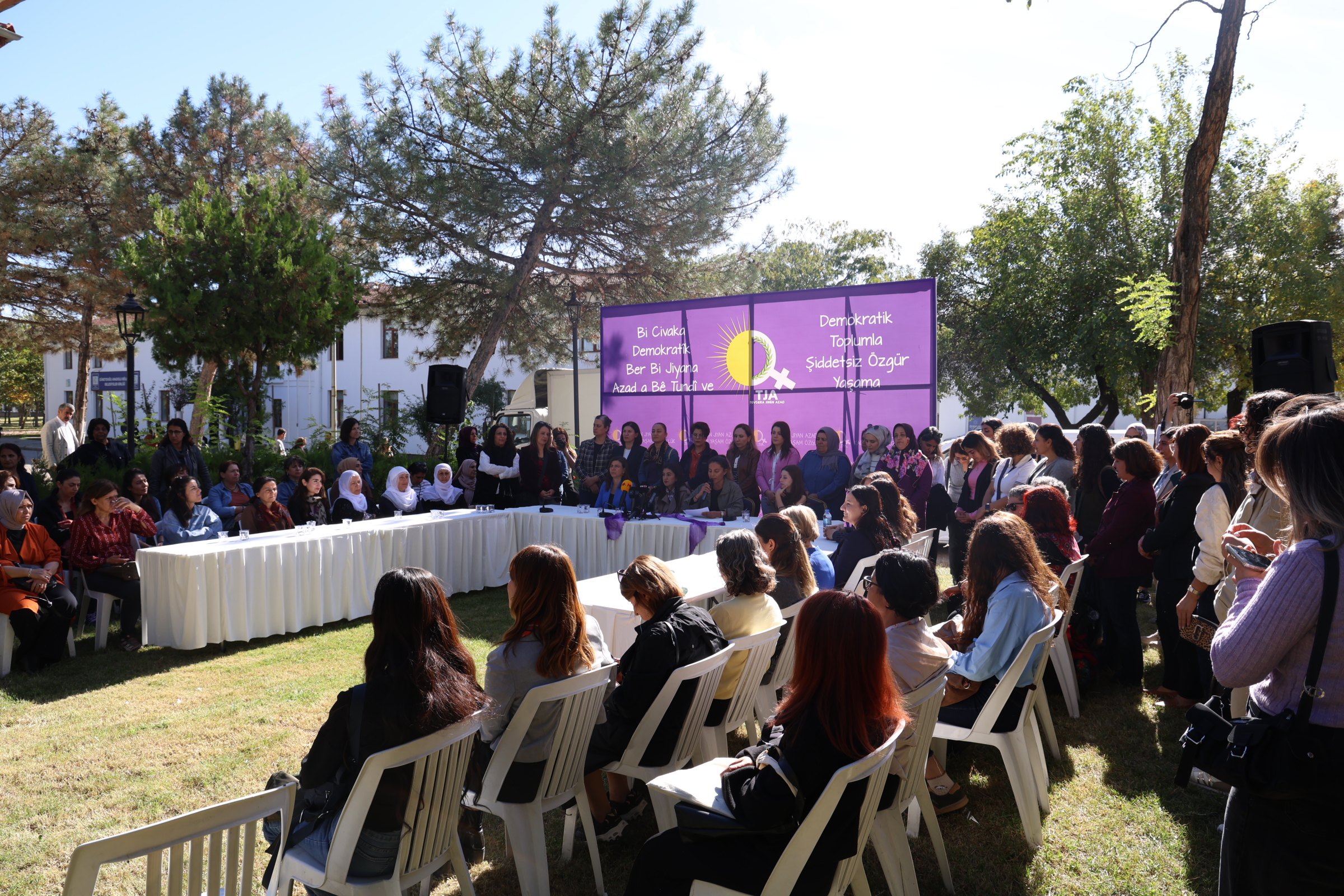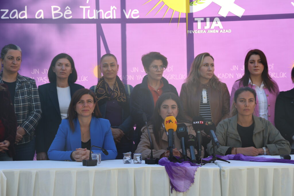 Tevgera Jinên Azad (TJA) bi dirûşma “Bi civaka demokratîk ber bi jiyana azad a bêşidet ve” deklarasyona 25ê Mijdarê Roja Têkoşîna Li Dijî Şideta Li Ser Jinan eşkere kir. Ji bo deklarasyonê li ber DÎKASÛMê ya li Sumer Parka navçeya Yenîşehîra Amedê daxuyanî hate dayîn. Hevşaredara Bajarê Mezin a Amedê Serra Bucak, Aktîvîstên TJAyê û Dayikên Aştiyê tev li daxuyaniyê bûn. TJAyê bi eşkerekirina deklarasyonê dest bi çalakiyên 25ê Mijdarê dike.