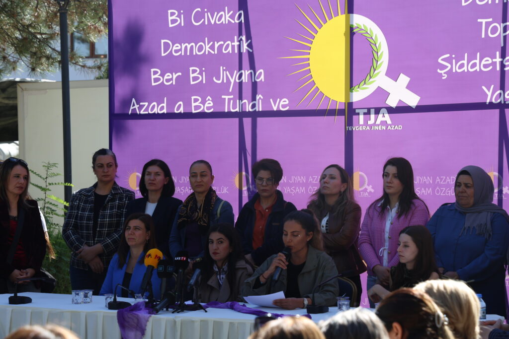 Em pêvajoya Aştî û Civaka Demokratîk a ku di 27ê Sibatê de bi banga Rêberê Gelê Kurd birêz Abdullah Ocalan dest pê kir, ji têkoşîna azadiya jinan ya ku em li dijî sîstema serweriya mêr didin, cuda nabînin. Ji ber ku em dizanin şer, li vê erdnîgariyê herî zêde jiyana jinan û zarokan hilweşand. Bi hezaran jinann Kurd hatin qetilkirin, îşkence dîtin, bi zorê ji cih û warên xwe hatin kirin; mîlîtarîzma ku hat gurkirin, bedena jinan, ked û nasnameya wê kir hedef.