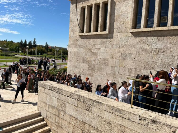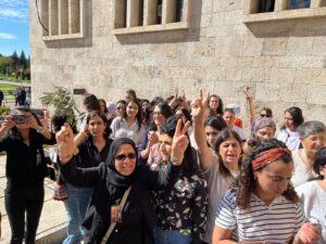 Enqere – Meşa Tevgera Jinên Azad di roja 7emîn de gihişt Enqereyê û tev li civîna koma DEM Partiyê ya Meclisê bûn. Dema jin ketin Meclisê dirûşmên “Bijî Serok Apo”, “Em bi hêviyê ber bi azadiyê ve dimeşin” berz kirin.