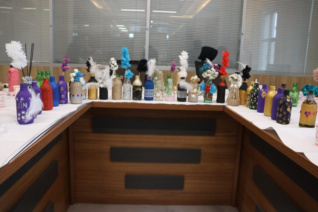 Di karhegê de jinên ku bi awayekî kêfxweşî dema xwe bi awayeke sûdewer derbas dikin, şûşeyên sodayê yên ku bi gelemperî tên avêtin, bi sêwirandinên xwe boyax dikin û bi têlên jûtê dixemilînin û vediguherînin vazoyan. Çiqilên darên hişk jî yek bi yek dixemilînin û dikin xemlên kulîlkan. Berhemên ku dertên holê, nîşan didin ku bermayî, bi ked û afirîneriyê çawa ji nû ve nirxdar bibin. Bi nirxandina ji nû ve ya şûşeyên cam, ên ku bi sed salan di xwezayê de dimînin hem feraseta parastina jîngehê pêş dixe hem jî bermayî bi xemilandinên resen malan xweşiktir nîşan didin.