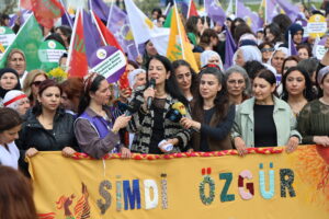 Îro hemû jin, di serî de jinên Kurd ên ku encamên polîtîkayên şer di asta herî jor de dijîn, azadiya Rêberê Gelan Birêz Abdullah Ocalan ku vîna aştiyê nîşan daye, wekî azadiya xwe dibînin. Divê were zanîn ku hêza pêşeng a vîna dê dawî li vê pergala şer, rant û talanê mezin dike, bîne em in. Li dijî hemû hêzên ku dixwazin li pêşiya riya aştî, edalet û azadiyê astengiyan derxin, em carek din bi bîr dixin ku di ser bangawaziya Rêberê Gelan Birêz Abdullah Ocalan a ji bo Aştî û Civaka Demokratîk re salek, mehek û 23 roj derbas bûn.