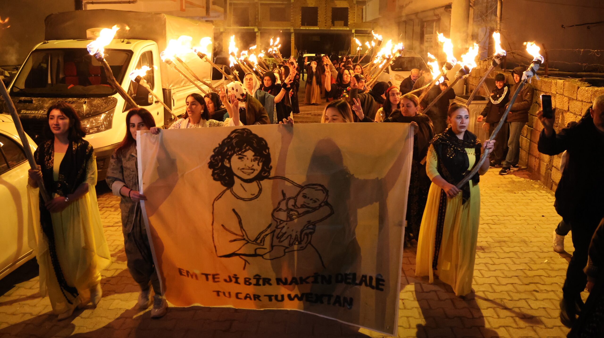 Jinên ku li ber avahiya Rêxistina Partiya Wekhevî û Demokrasiyê ya Gelan (DEM Partî) a Hezexê hatin cem hev, bi meşaleyan ber bi qada pîrozbahiyê ve meşiyan. Jinan di meşê de posterê Rehşan Demîrel a ku di sala 1992yan de ji bo protestokirina êrişên li ser pîrozbahiyên Newrozê laşê xwe dabû ber agir, hilgirtin.
