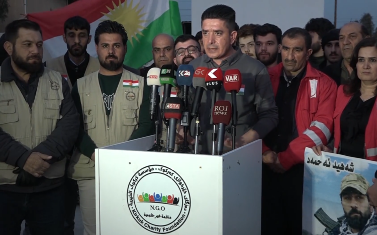 Têkildarî qampanyaya alîkariyê li Salona Şahiyan ya Taxa Şorçey ya Kerkûkê daxuyaniyek hate dayîn. Yek ji rêveberên qampanyaya alîkariyê Hêmin Hesîb têkildarî xebatan agahî dan û balkişand ser pêwistiya alîkarî û hîstiyariya gelê Kerkûkê. Hêmîn wiha axivî: “Piştî komkirina alîkariyê niha bi hevkariya Heyva Sor ya Kurdistanê, me dest bi şandina alîkariyê kir. Alîkariyên me wekî karwanek duyemîn ji bo Rojava derket rê.”