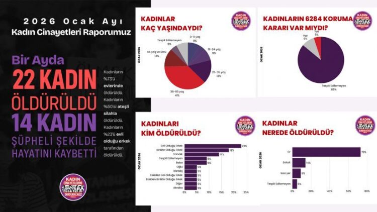 Li gorî daneyên rapora Platforma Em ê Cînayetên Jinan Rawestînin (KCDP) di meha çileyê de 22 jin hatin kuştin û 14 jin bi awayekî gumanbar jiyana xwe ji dest dan.