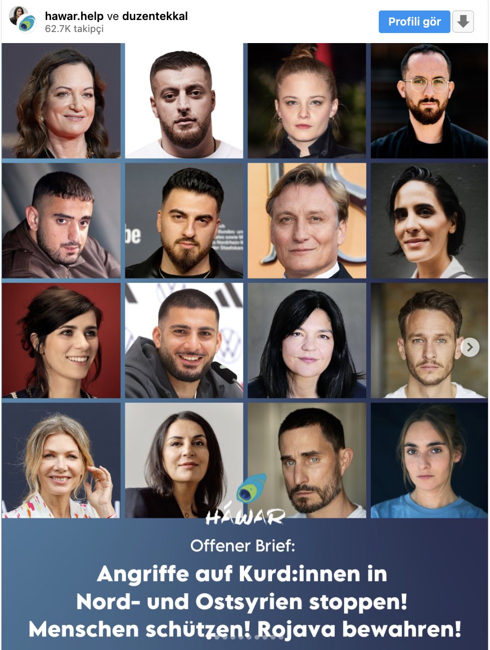 Komeleya Gêlên di Bin Xetere de Ye û civaka Kurd li Elmanyayê li dijî êrîş û dorpêça çeteyên HTŞ, DAIŞ, SMO û Tirkiyeyê li ser Rojava nameyek ji Yekitiya Ewropa (YE) û Hikumeta Federal a Elmanyayê re şand. Lîstikvanê Futolê Denîz Undav û kesên weke Natalia Worner, Aykut Anhan, Ursula Karven,Huseyin Kokseçen, Clemens Schick, Tahsim Durgun,Nora Tschirner,Igor Levit, Jasna Fritzi Bauerve, Jasmin Tabata û gelek kesên navdar tevlî banga komeleyê bûn.