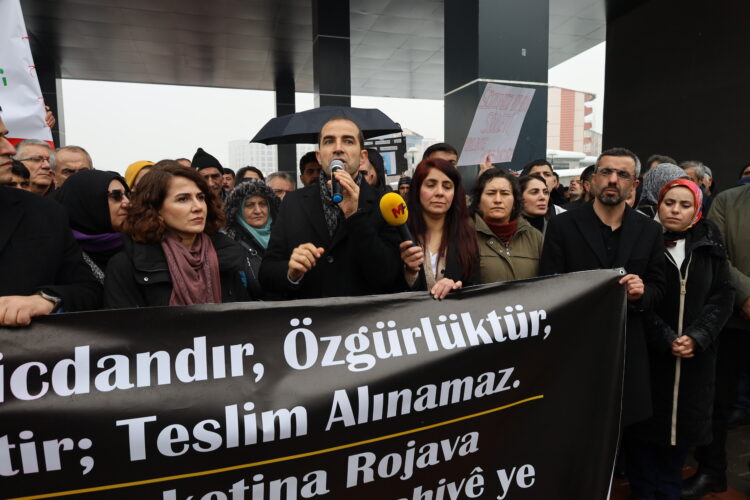 Di çalakiyê de Hevserokê DBPê Keskîn Bayindir axaftinek kir. Keskîn Bayindir astengkirina meşê ya ji bo Rojava şermezar kir û got: “Em ji bo mirovahî û azadiyê dimeşin. Em li dijî hişmendiya HTŞê û DAIŞê dimeşin, lê hûn bi van kirinên xwe piştevaniya wan dikin. Gelê Kurd sinorên we yên xeyalî nas nekirin û heya azad ne be jî nas nake. Gelê Kurd bi berxwedana xwe cîhan rakire ser pêyan û hevpeymanek da îmzekirin.”