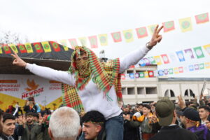 Hevserokê Giştî yê DBPê Keskîn Bayindir jî diyar kir ku agirê Newrozê ji roja yekem ve her ku diçe geştir dibe û got: “Newroza 2026an, azadbûna Rêber Ocalan û gelê Kurd e. Ez Newroza girtiyan jî pîroz dikim. Heke em îro dikarin vê Newrozê pîroz bikin, bi saya têkoşîna hatî dayîn e. Gelê Kurd bi rojan e Newrozê pîroz dike û dixwaze qedera xwe bi destê xwe tayîn bike. Em jî ji bo vê têkoşînê dikin. Duh girtiyekî siyasî di girtîgehê de jiyana xwe ji dest da. Di dema ku Devlet Bahçelî digot ‘hûn nikarin Kurd û Tirkan ji hev veqetînin’, hevalê me yê girtî jiyana xwe ji dest da. Heke niyeta we biratî û aşitî be, rêya wê diyar e. Dawî li dijminatiya li dijî Kurdan bînin, bila Rêber Ocalan azad bibe. Azadiya Rêber Ocalan azadiya gelê Kurd e. Bila baş bizanibin ku gelê Kurd li hemberî zaliman serî netewandiye û wê netewîne jî. Em baweriya xwe bi vê pêvajoya ku Rêberê Gelê Kurd Abdullah Ocalan pêşengiya wê dike, tînin. Em ji bo statu, ziman û rûmeta xwe têkoşînê dikin û em ê berdewam bikin.”